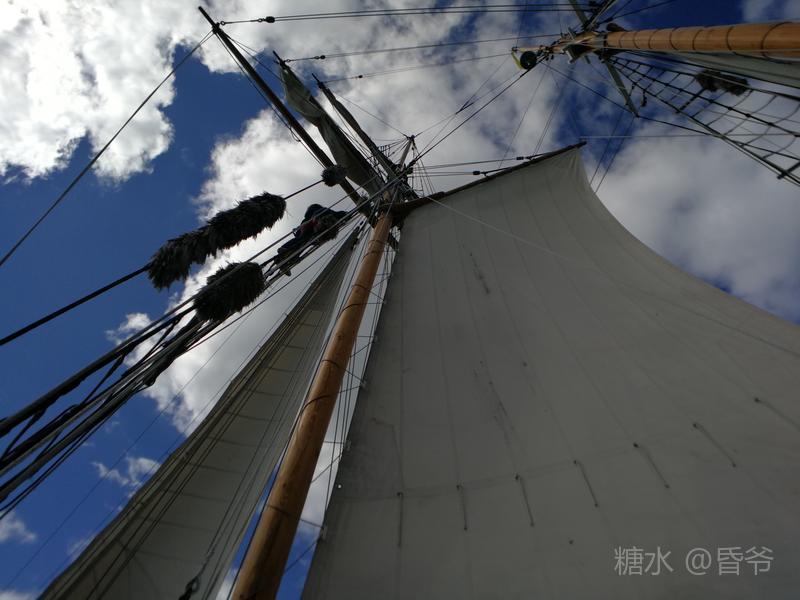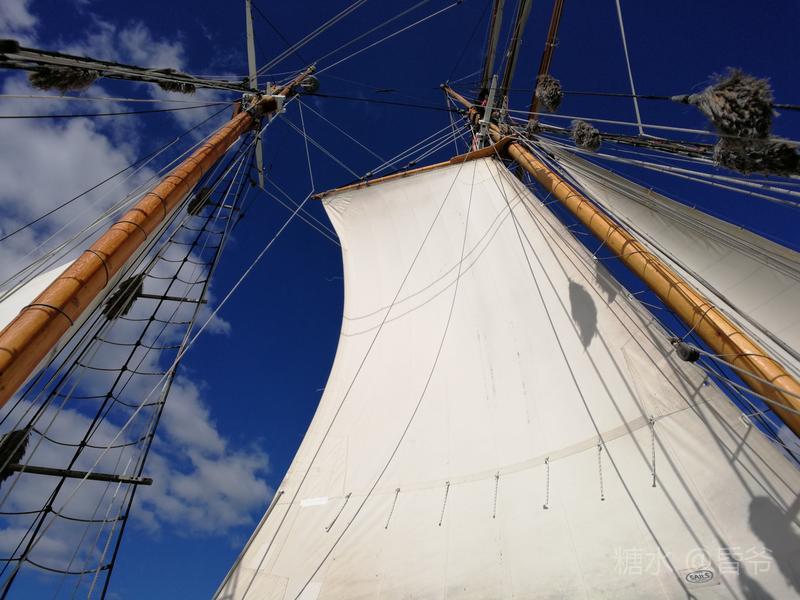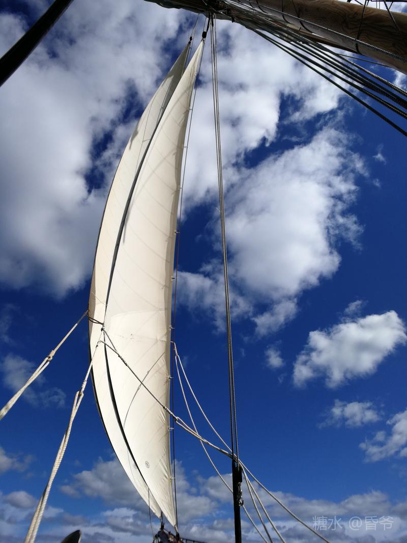 帆船上竖立着两根高高的桅杆,当白色的风帆升起来时,被海风吹的鼓鼓的,如果风帆是侧面受风,整个船身会呈倾斜状,在甲班上都会有被掀翻的感觉,十分刺激。