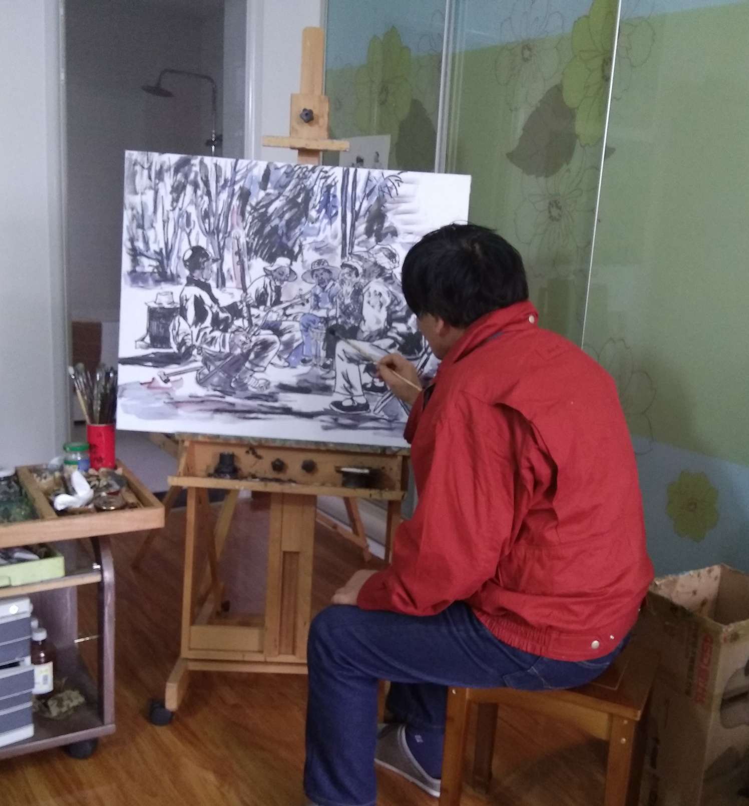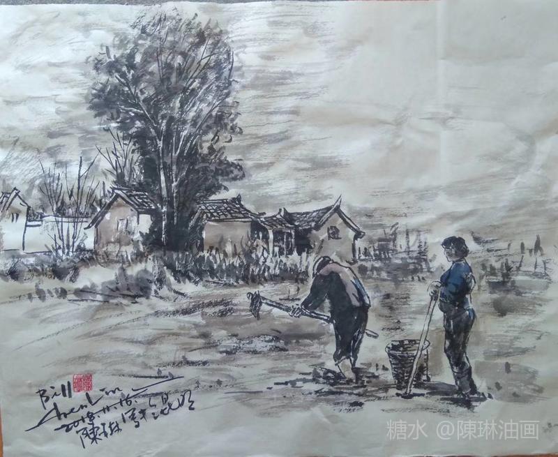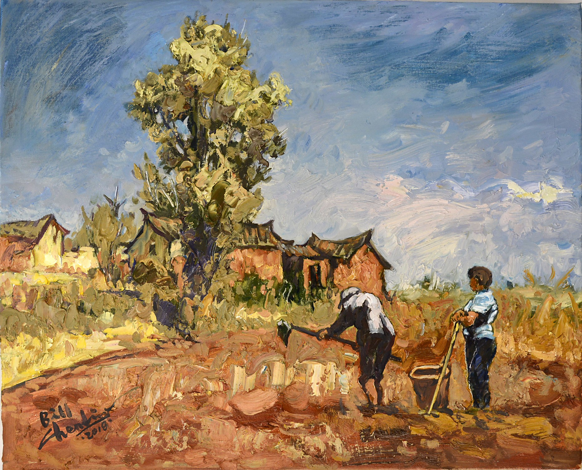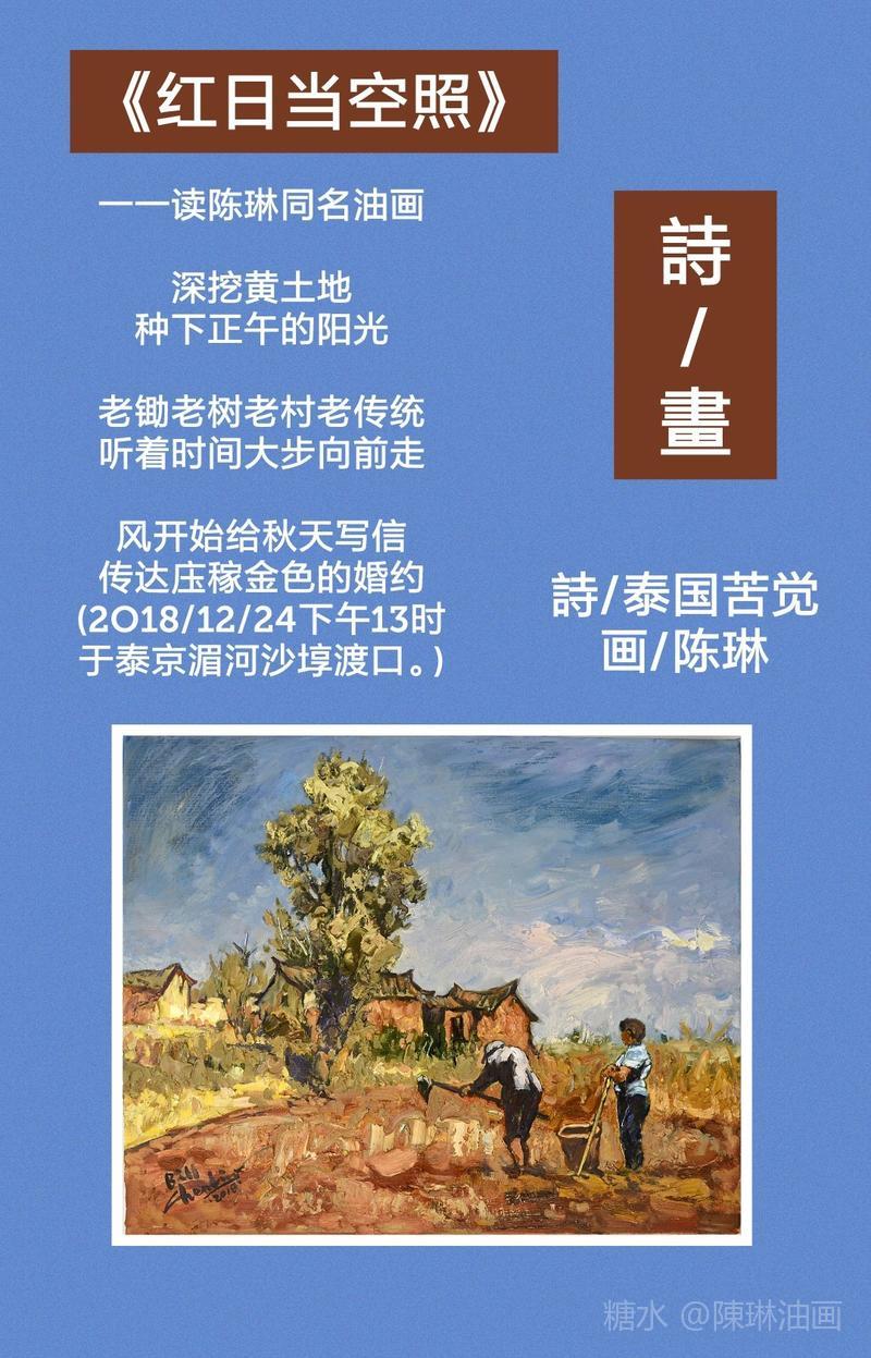 布面油画《红日当空照》 作者:陈琳 规格50*60cm 《红日当空照》 作者/陈琳 红日当空照 农家活计忙 翻土施肥平土地 来年收成好 大田种庄稼 屋旁栽蔬菜 一年四季食无缺 平安度流年