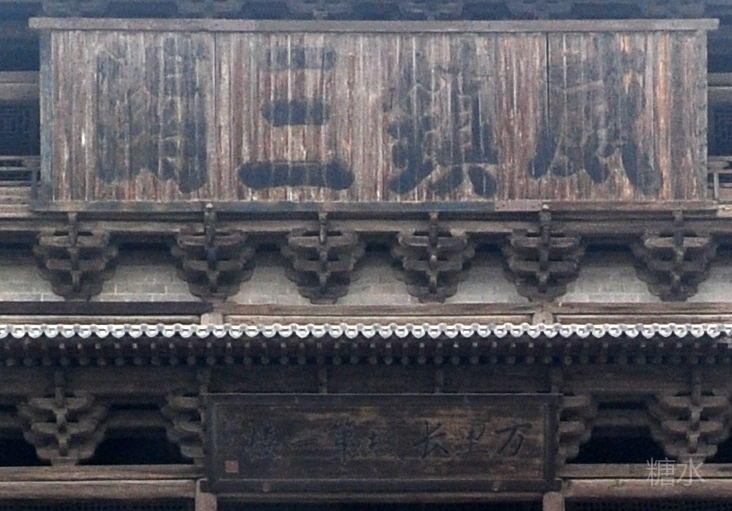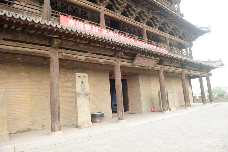 据说“声闻四达”匾额是亚洲第一巨匾,长8米宽3米,在远处看不觉得有那么大,但还是很醒目的,四个字雄浑苍劲,语义豪放,真配得上这座高楼气势。匾额上方还有一块小一点的横匾“雁门第一楼”,看来“第一楼”早就有之,只是长城专家罗老先生把它从雁门关推到了万里长城。