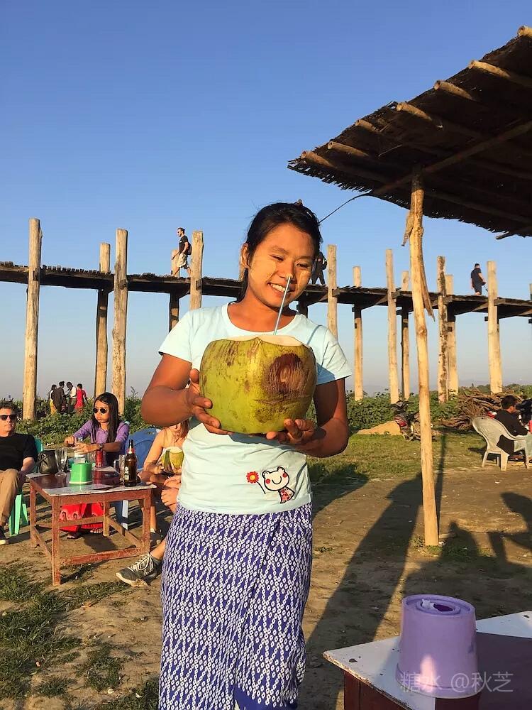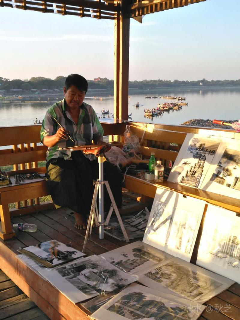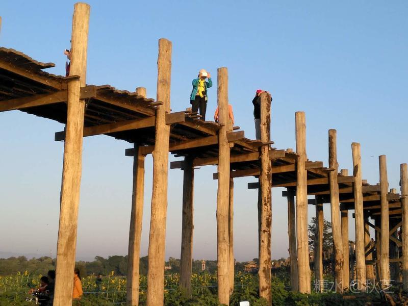 我们漫步在乌本桥上,桥上行人很多,有当地的缅人,有远来的游客,有穿着土红色僧袍的和尚,桥的两边有许多小商贩,若你停下看看,他们会给你个微笑。我们在桥上走了个来回,寻找最佳的拍摄点,记录下最美的瞬间。