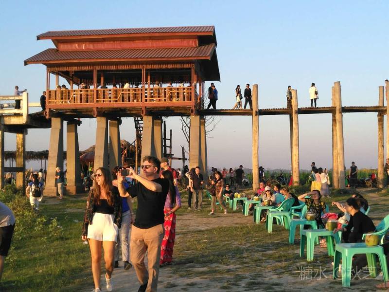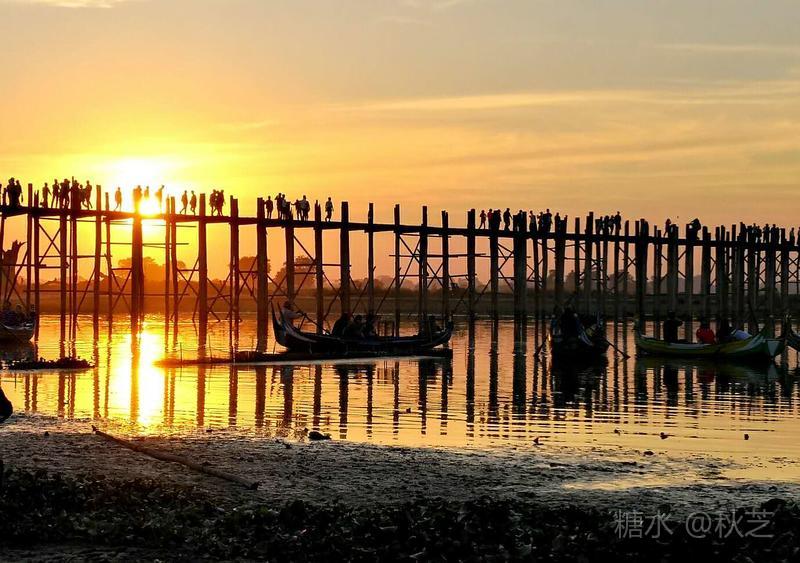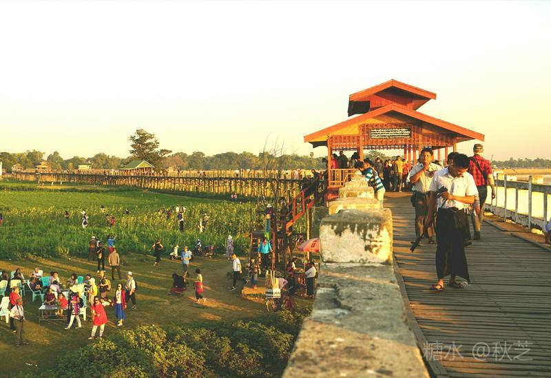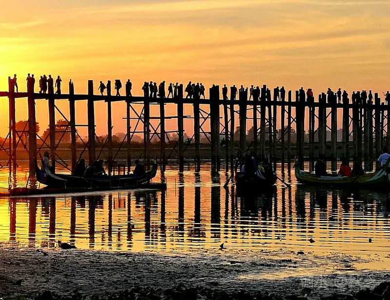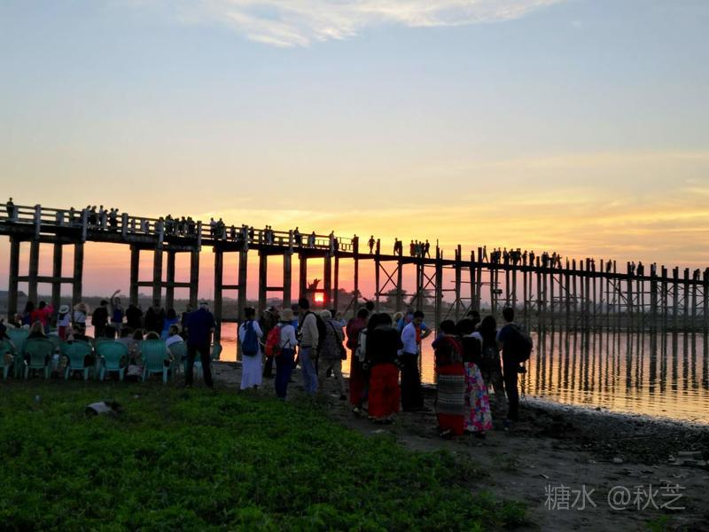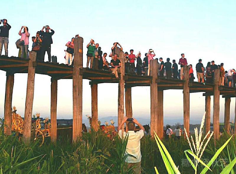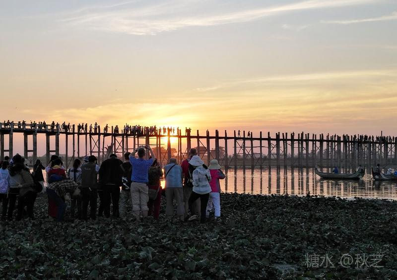 桥上人头攒动,众多摄影爱好者拿着手机和相机,拍摄乌本桥最美的景观。乌本桥桥面不宽,在光影的作用下,远远望去,展现出一幅美丽的画面,瑰丽的夕阳含蓄抽象,让人赞叹不已!