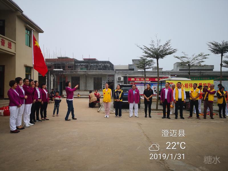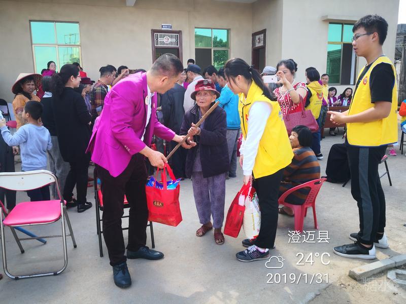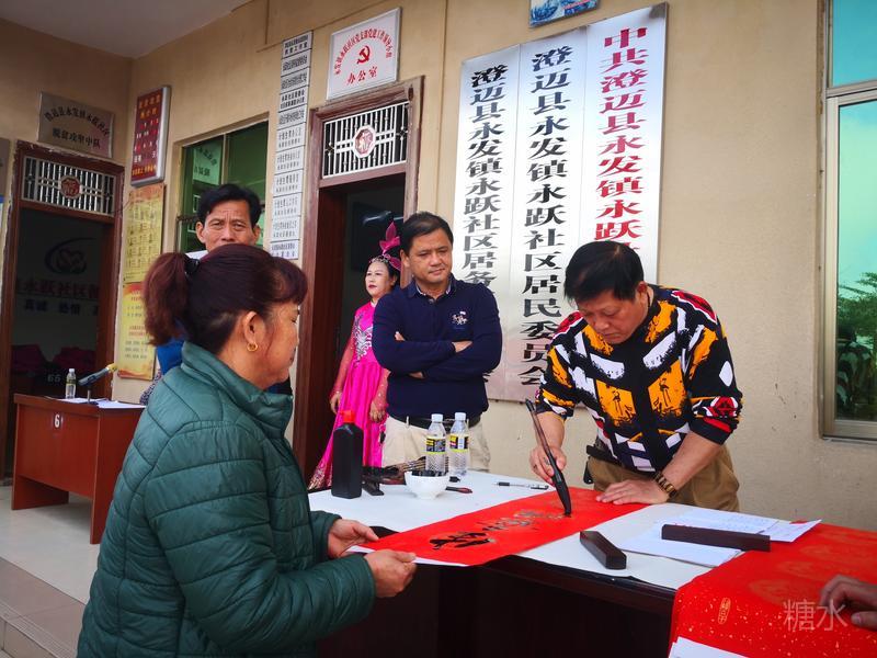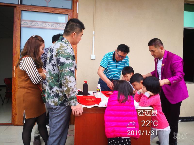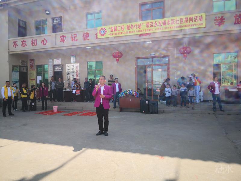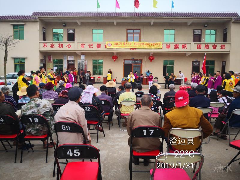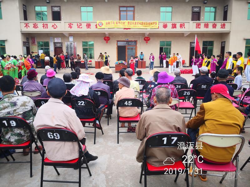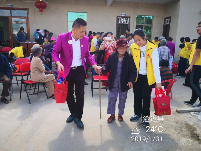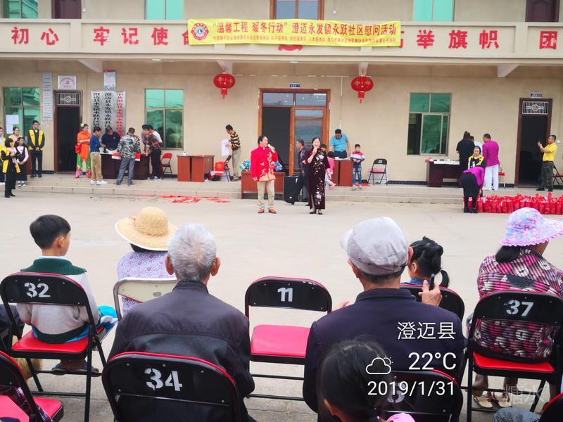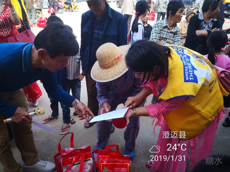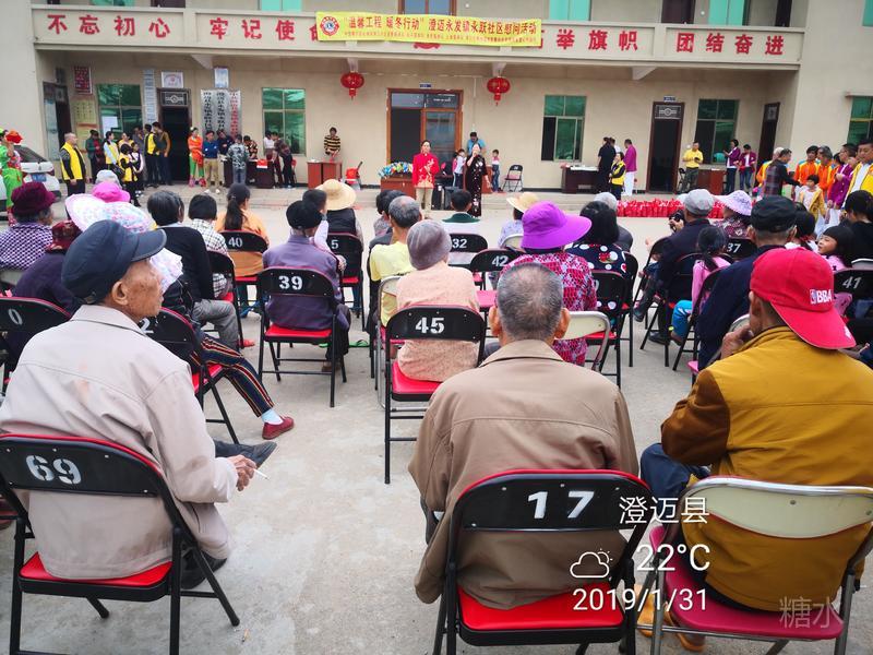 1月31日上午七点四十在海口老市委大院集合,六十多位志愿者自驾车八点出发前往澄迈县永发镇永跃社区,主办方购买大米、食用油、芝麻糊、营养麦片、核桃粉、金永丰佐料套装等赠送给35户孤寡老人和特困家庭。九点抵达永跃社区,物资组、书法组、文艺组、义诊组立即投入准备工作。