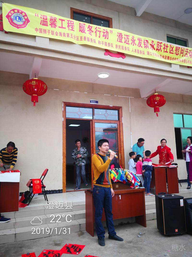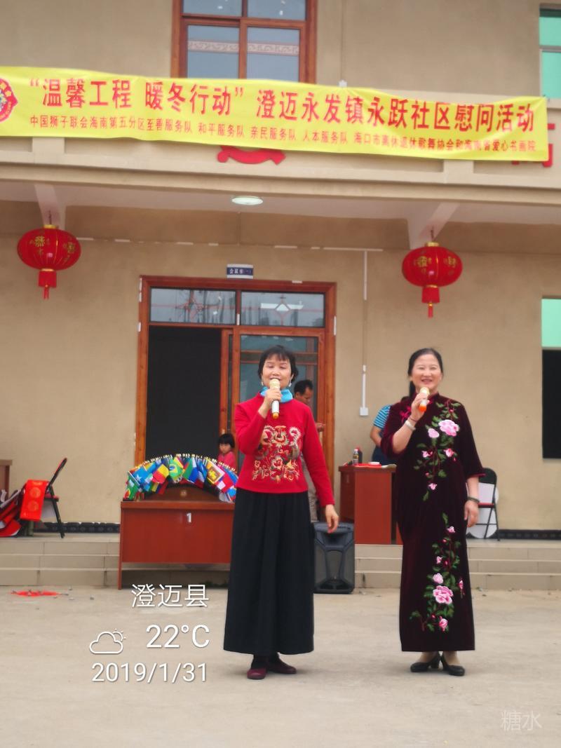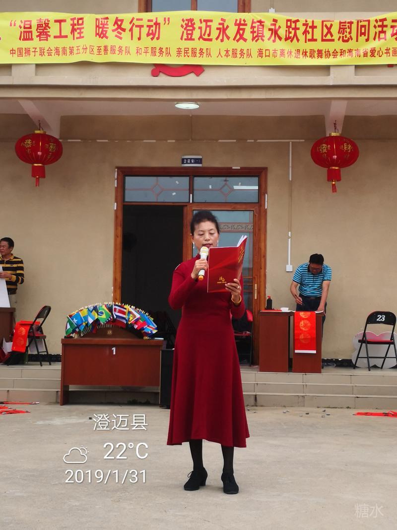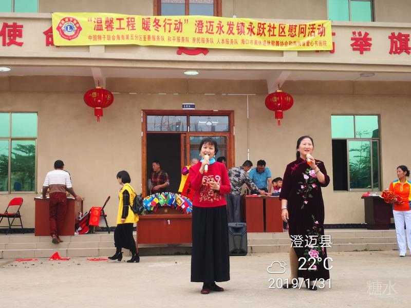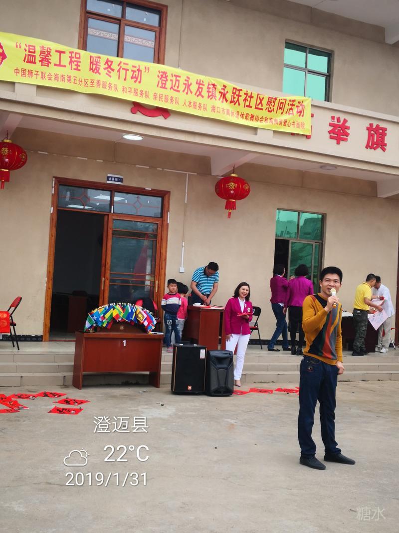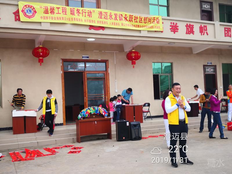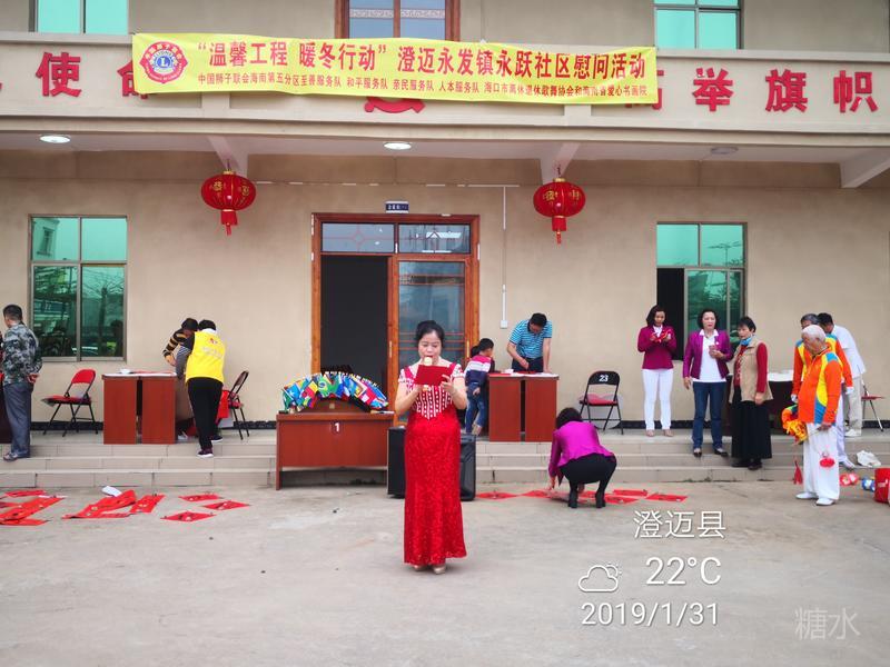 【通知】"温馨工程•暖冬行动"慰问永发镇永跃社区孤寡老人特困家庭活动1月31日周四上午进行,由中国狮子联会海南第五分区至善队、和平队、亲民队、人本队四个服务队共同主办,海口市离休退休歌舞协会、海南省爱心书画院、中狮联海南明德队和慈福队协办,活动内容包括文艺表演、书写春联、中医义诊、赠送慰问礼品等。