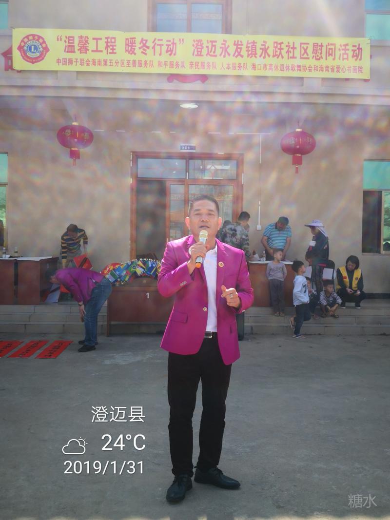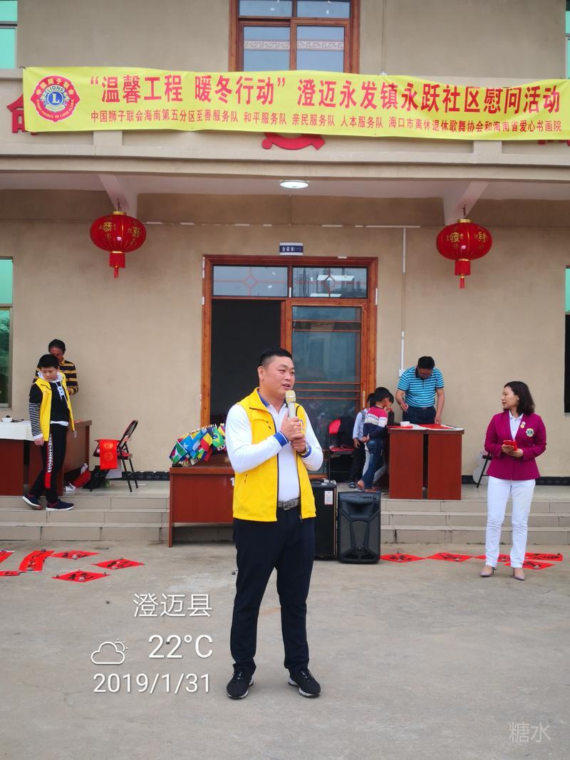 中国狮子联会海南代表处第一副主席刘超狮兄向永跃社区的居民问好,祝愿老人们健康长寿,祝愿志愿者们家庭幸福。
