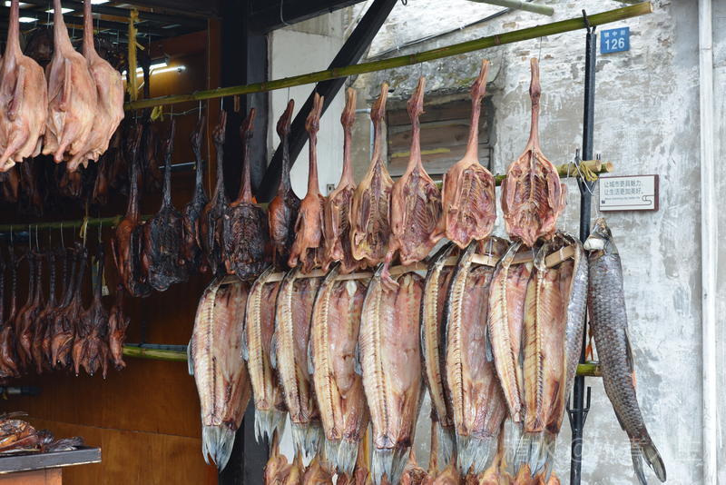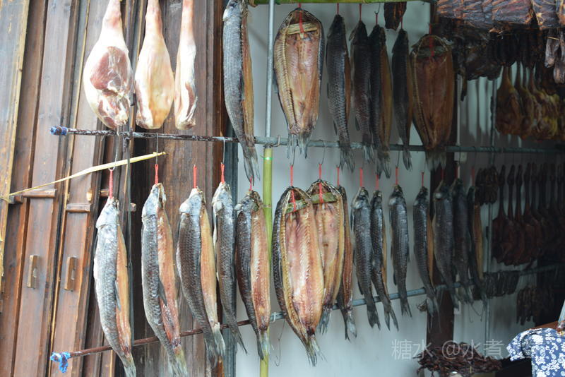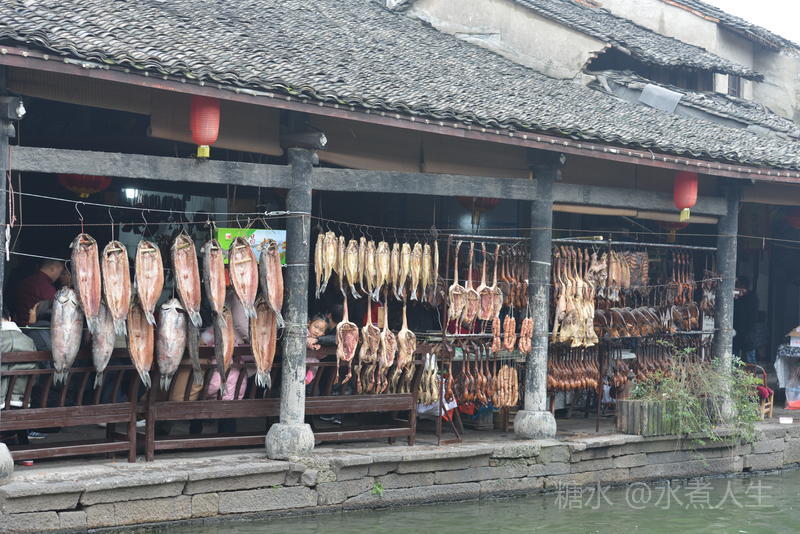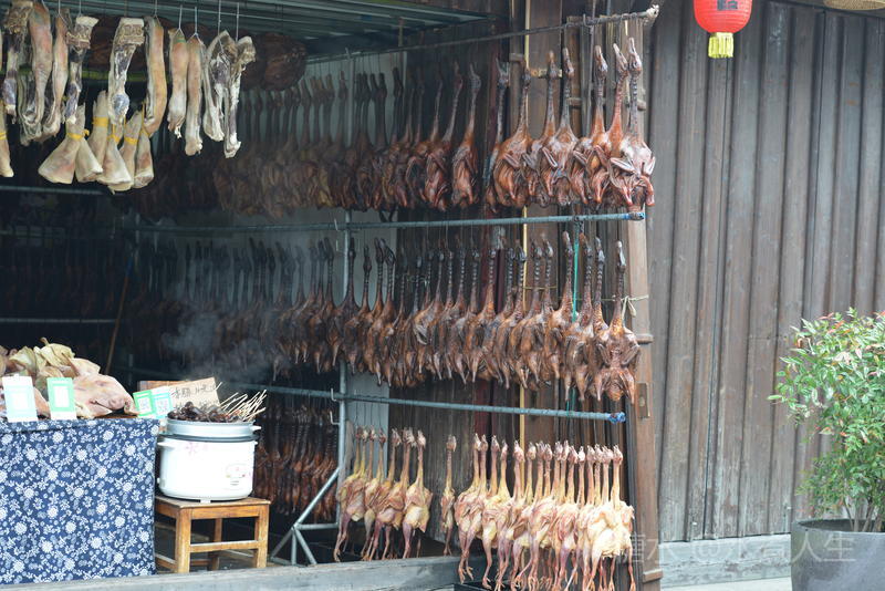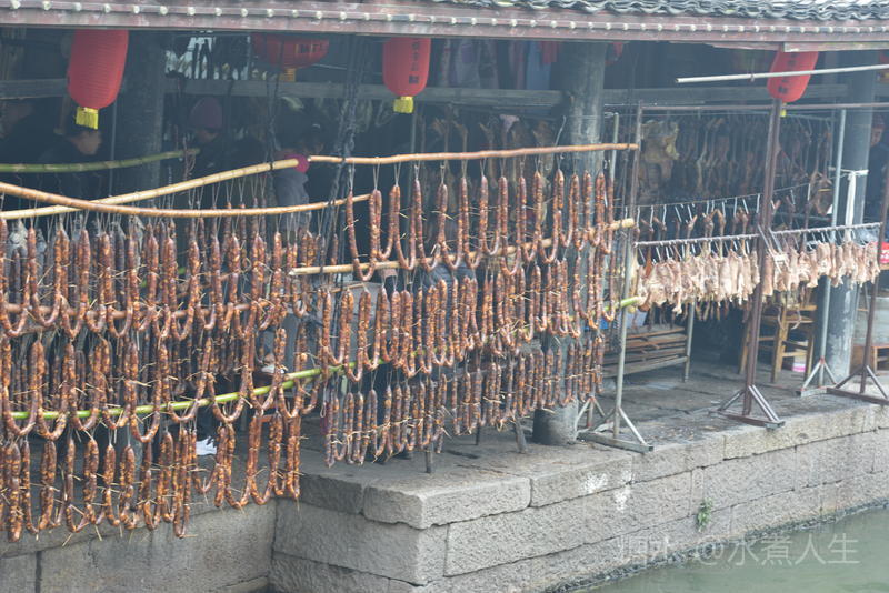 一商店在河边的杆子上挂满了腊肠,腊肠也是安昌古镇的一个标牌。