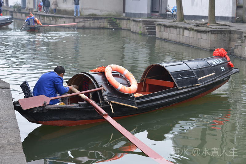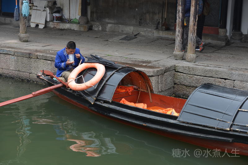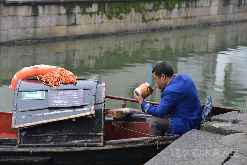 午饭时分,船工就坐在乌篷船上休息片刻,午餐是自带的饭菜。真应该向坚守在岗位的劳动者致以诚挚的谢意。