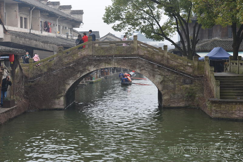 老石桥及桥洞下即将穿过的乌篷船