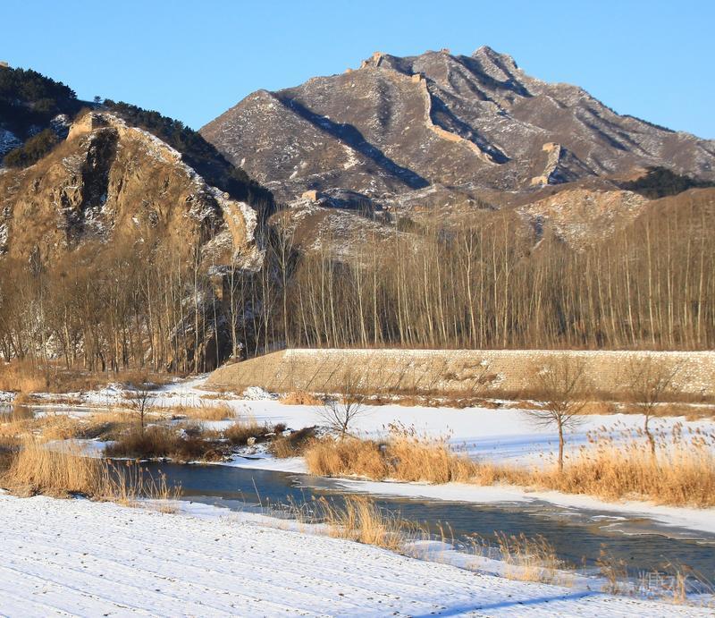 古北口蟠龙山远端是将军楼,近端是密云310号敌台,张保田摄于2010年1月。 注:拍摄彩色片时并未收集到相应的老照片,例如此处彩色片是2010年拍摄的,而黑白老照片则是2019年刚刚收集到,所以彩色片不是黑白片的精确复拍片,但凭借彩色片可以无争议地判定黑白片的拍摄地点。同时新老照片对比,展示了近端密云310号敌台上层损坏情况。