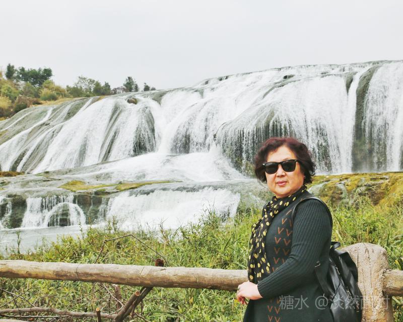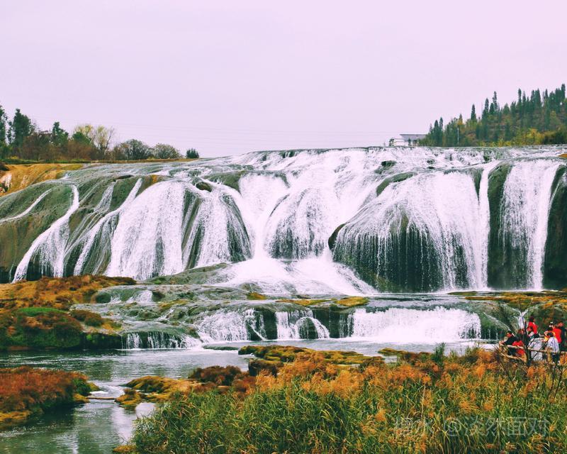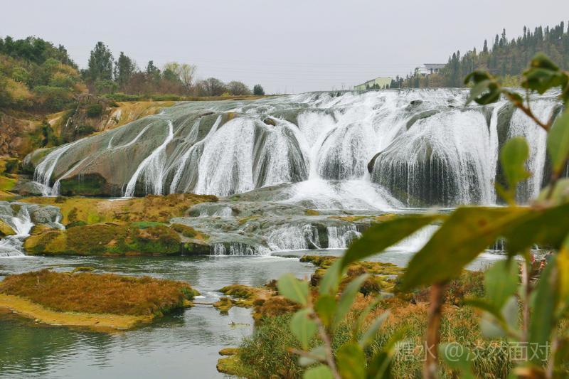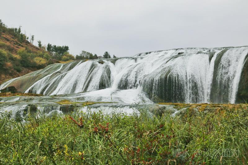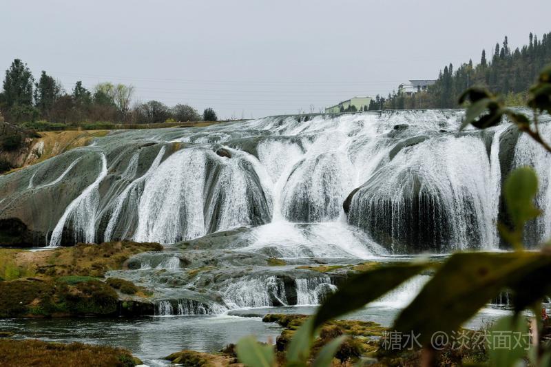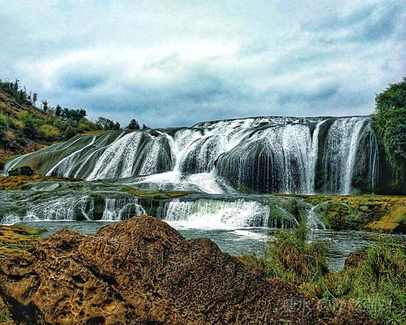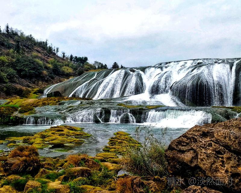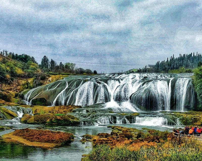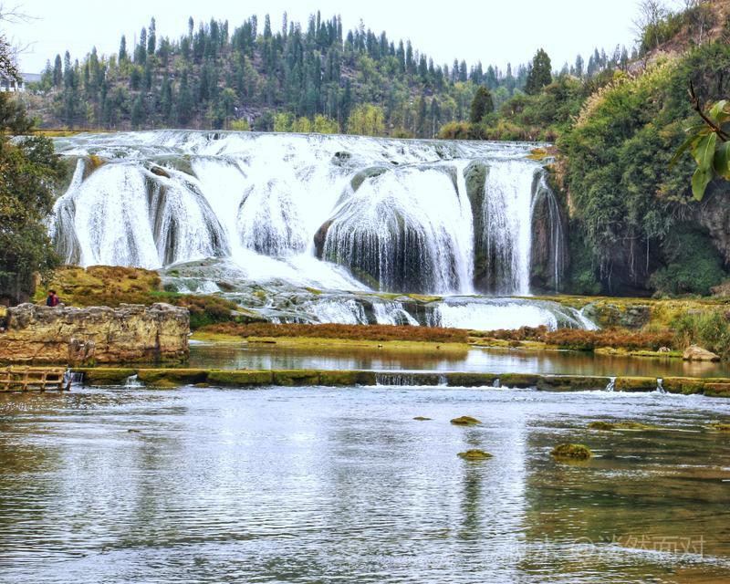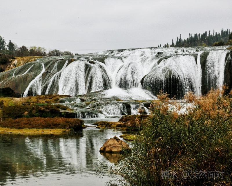看到的瀑布水层沿着和缓的瀑面,均匀地撒开,在一鳞鳞的钙华滩面上轻盈地舞着,如一层薄薄的、半透明的面纱,又如一面面张开的素绢扇面。