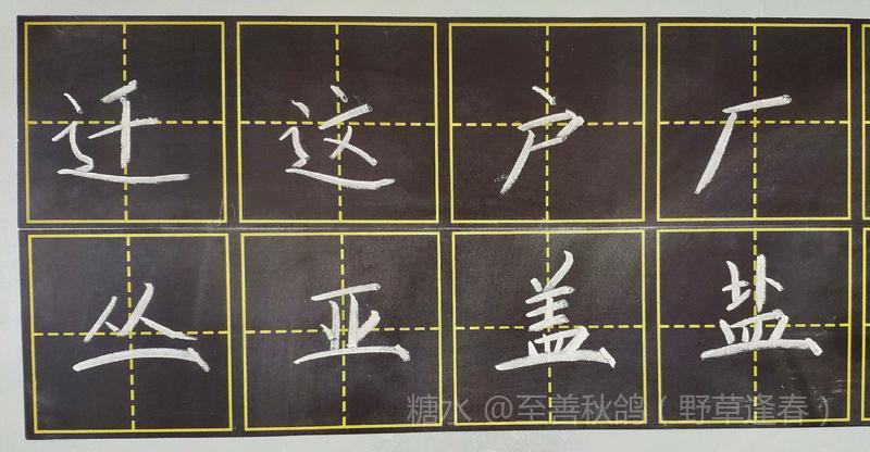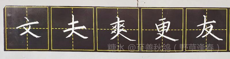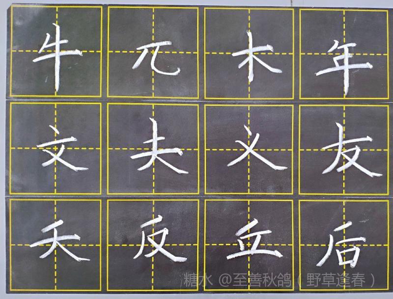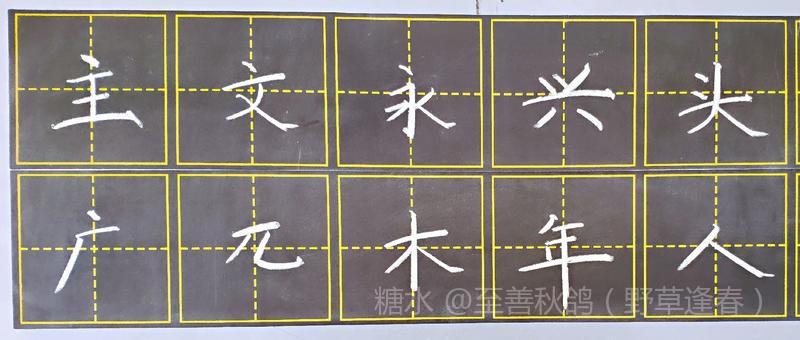 (三)“点”的写法:口诀是:“由轻到重,右下侧按”。例如:主、文、永、兴、头。注意:“文”字点与撇、捺交叉点在同一条垂线上。 (四)“撇”的写法。 口诀是:“略按左下行,末尾快出锋”(除“竖撇”外,其余的“撇”必须直)。“撇”分三种: 一是斜撇。例如:广、兀、木、年、人; 二是竖撇。例如:文、夫、爽、更、友; 三是短平撇,出现在字的左部、中间或首笔。如:广、兀、木、年;文、夫、义、友;夭、反、上、后。 (五)“捺”的写法。 口诀是:“捺时稍用力,向右快出锋”。例如:人、入、又、会、吏。 还有一种是走字底中用的平捺。例如:这、远、通、近、过。 注意:把撇、捺组成“人”字时,注意撇要张开些,做到撇高捺低。