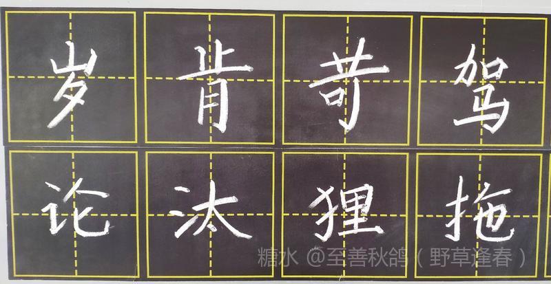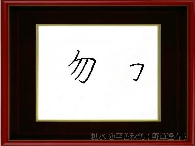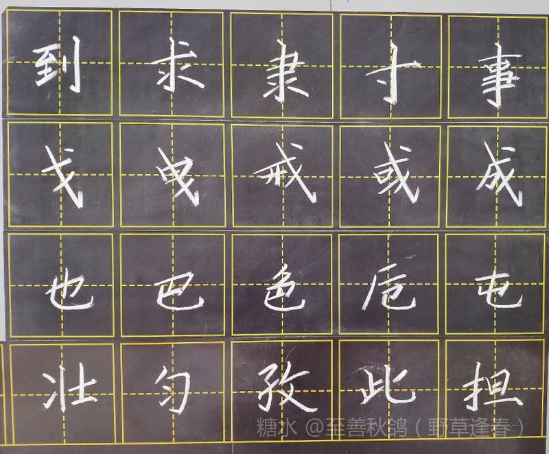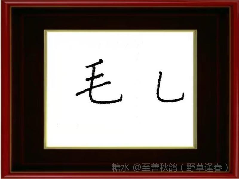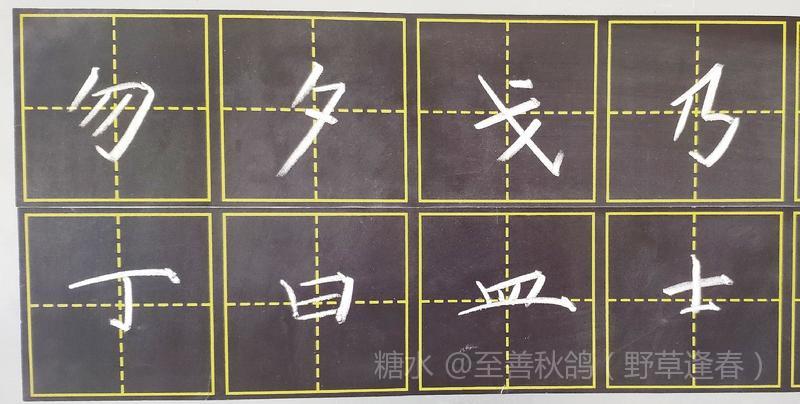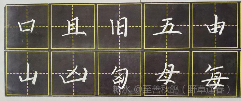 (六)“折”的写法。两笔交接处,稍按才有力。例如:口、且、旧、五、由;山、凶、匈、母、每。 注意:“口”、“山”中的左竖与右竖成“倒八形”。 (七)“钩”的写法。 “竖钩”:右下落笔稍按,左方钩出挺腰。例如:到、求、隶、寸、事。 “斜钩”:略按后右下行,末端稍按笔尖挑。例如:戈、曳、戒、或、成。 “竖弯钩”:形状像浮鹅,古人称之浮鹅钩。书写时注意两点:一是竖下时有一个曲臂状,呈圆弧形,如果写成方折就错了;二是底端较平,出钩朝上,不能朝内。例如:也、巴、色、卮、屯。 (八)“提”的写法。口诀是:“右下按,右上提,动作快,像匕首”。例如:壮、匀、孜、此、担。注意:“壮”字的左竖必须胸腰前挺。