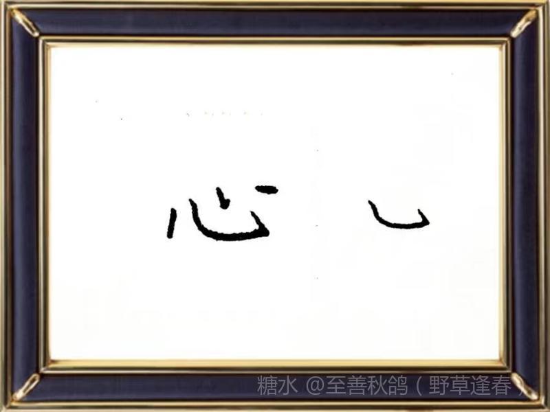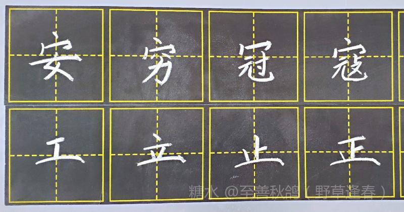 (三)“个性”要突出 许多独体字都有自已独特的个性,我们必须顺其自然,表现出各种不同的姿态。 (1)本身斜的,顺其斜势。勿、夕、戈、乃。 (2)本身扁的,不要拉长。丁、曰、皿、士。 (3)本身长的,不能压扁。月、言、肖、弓。 (4)本身小的,不能放大。么、口、日、壬。 (5)有边框的,不要撑足。冈、罔、因、图。 (四)“帽”大“底”要长。 (1)“帽”指宝盖、秃宝盖,绝大多数“帽子”是大的,它可以罩住下面;罩不住,就会头重脚轻。例如:宝、宫、宣、军。 (2)“帽子”延伸,一般带有横钩的字头也要大:例如:帘、尝、雷、霜。 (3)但也有两个例外:“安”字宝盖要小。凡是宝盖下有竖弯钩或撇捺相衔接的,则不宜大,大了反而头重脚轻。 (4)“底”指字的底部长横,长了就能稳稳地托住上面。如:工、立、止、正。