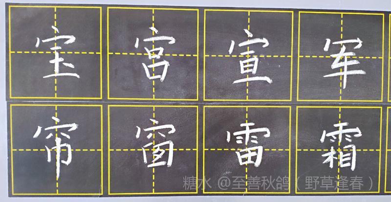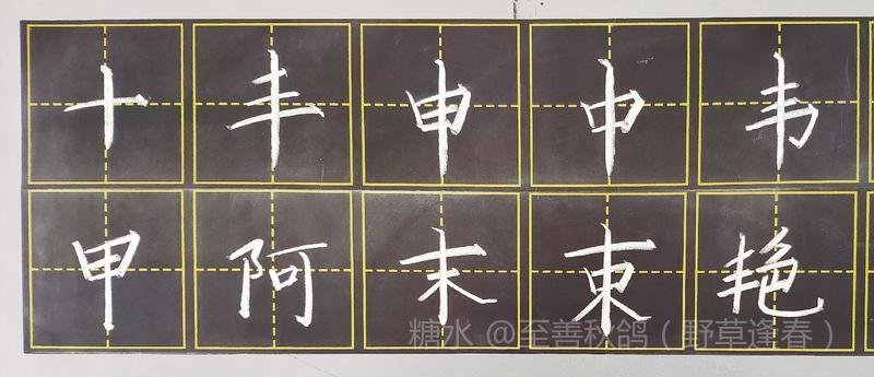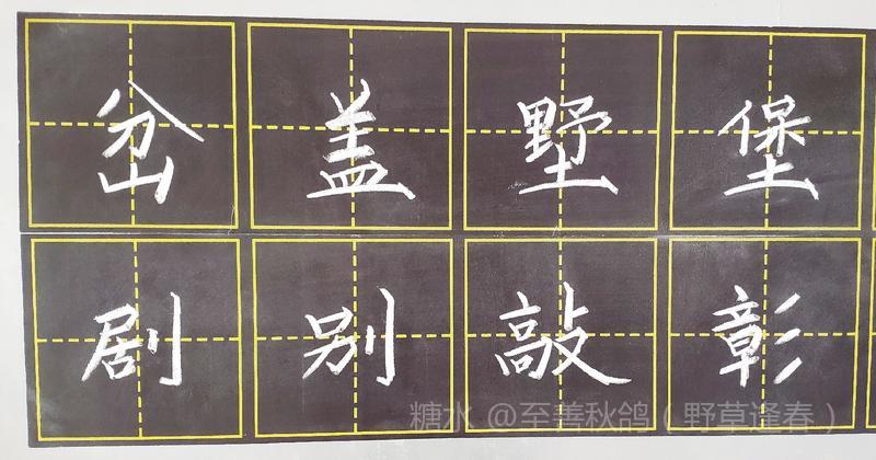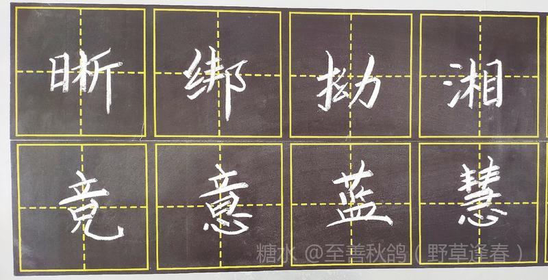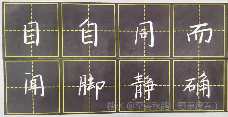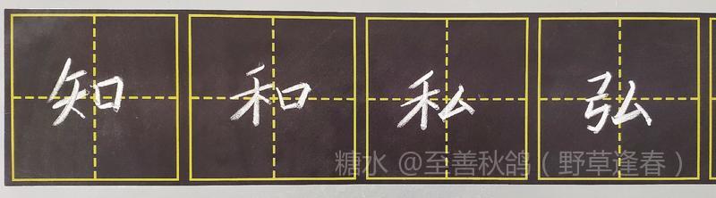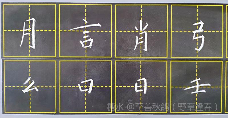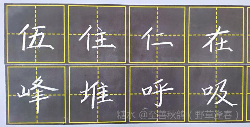 (五)左“高”右要“低”。 凡一字中有两笔或两笔以上的竖画、竖钩,都要注意左边高,右边低,就像我们在队伍中稍息,把重心落到了右脚上才感到安稳一样。 1.独体字:目、自、同、而。 2.合体字:闻、脚、静、确。 (六)“竖”低横要“高”。 这是合体字中常出现的,凡竖画、横画在字末一起出现的,竖要比横低。如:伍、住、仁、在。注意:如果一样齐平,反而显得松散。 (七)偏旁让位。 这是合体字中常出现的一种组合方法,为了整体安稳协调,局部则要有意识地收缩或舒展。 1.偏旁让位“山、土、口”作左偏旁时要适当升高。例如:峰、堆、呼、吸。 2.“口、厶”作右偏旁时要居中而略偏下。例如:知、和、私、弘。