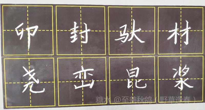 教学内容(三) 把房子建造得更加精巧些 ——正楷结构的七个规律 (一)重心求平稳 1.要仔细分析字的特上,善于从组合部分中找出主要笔画,把主笔写稳,重心就平稳了。 (1)主笔为捺或撇的:迁、近、户、厂。 (2)主笔为底下长横的:丛、亚、盖、盐。 (3)主笔为钩的:我、笔、行、列。 (4)主笔较长大的一笔:仲、群、韩、斜。 下列字的主笔是: 贵(横)、在(撇)、持(竖钩)、之(捺)、以(长点)、恒(底横)、培(横)、养(竖)、美(捺)、好(横)、情(横折钩)、操(捺)。 由此可见,主笔对整体起着平衡作用。 (二)比例要适当 1.左右、上下各二分之一: 卯、封、驮、材;尧、峦、昆、浆。 2.左中右、上中下各三分之一: 晰、绑、湘、抝;竞、意、蓝、慧。 3.三分之一比三分之二: 岁、肯、苛、驾;论、汰、狸、拖。 4.三分之二比三分之一: 岔、盖、堡、墅;剧、别、敲、彰。
