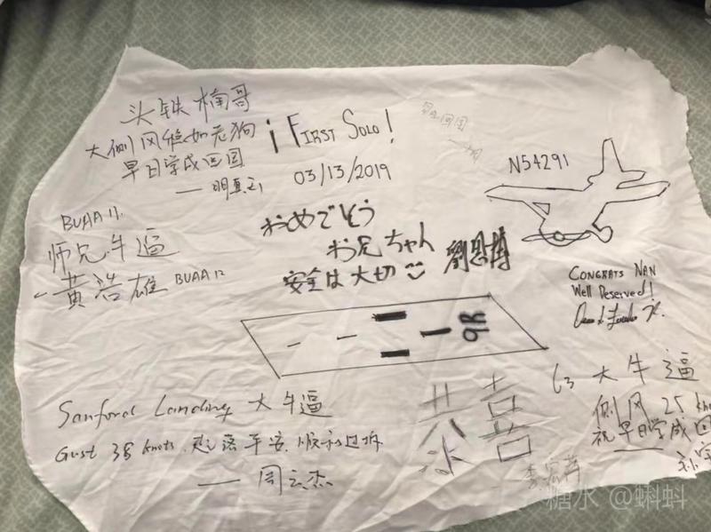单飞让我看来不仅仅考的是技术,更重要的是考心理。我一直在为他的心理承受能力担心,害怕他过不了这一关,那么他的这条路就会终止,今天他圆满的完成飞行,看来我的担心是多余的了,再听听他谈飞行过程:第一次单飞,不是害怕,而是感觉更多的是兴奋,操作程序有条不紊,什么都不想,在享受飞行的过程,降落几近完美。也许他已经找到飞行的感觉,看到他自信的表情,自信的言语,我为他感到骄傲。
