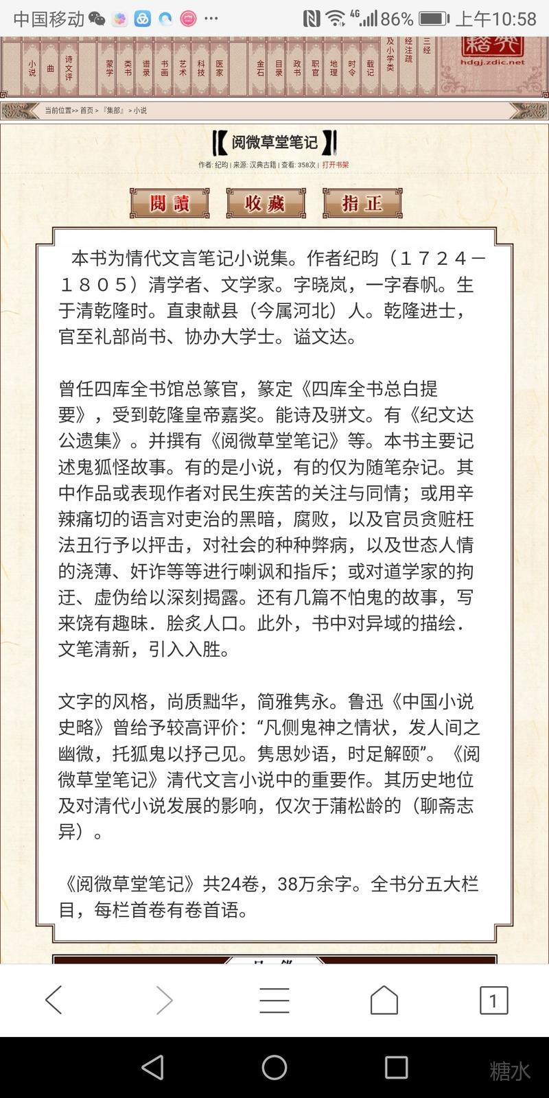 《阅微草堂笔记》 是清代文言小说中重要代表作 共24卷38万余字 其历史地位及影响 仅次于蒲松龄的《聊斋志异》 鲁迅《中国小说发展史略》中 也曾给予较高评价
