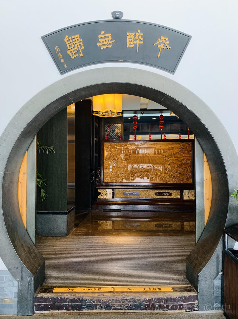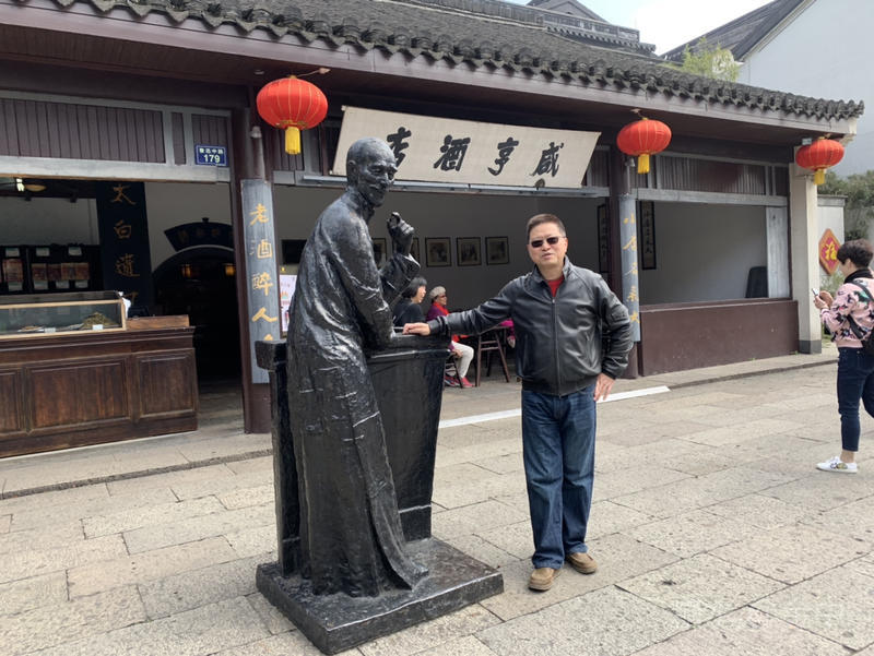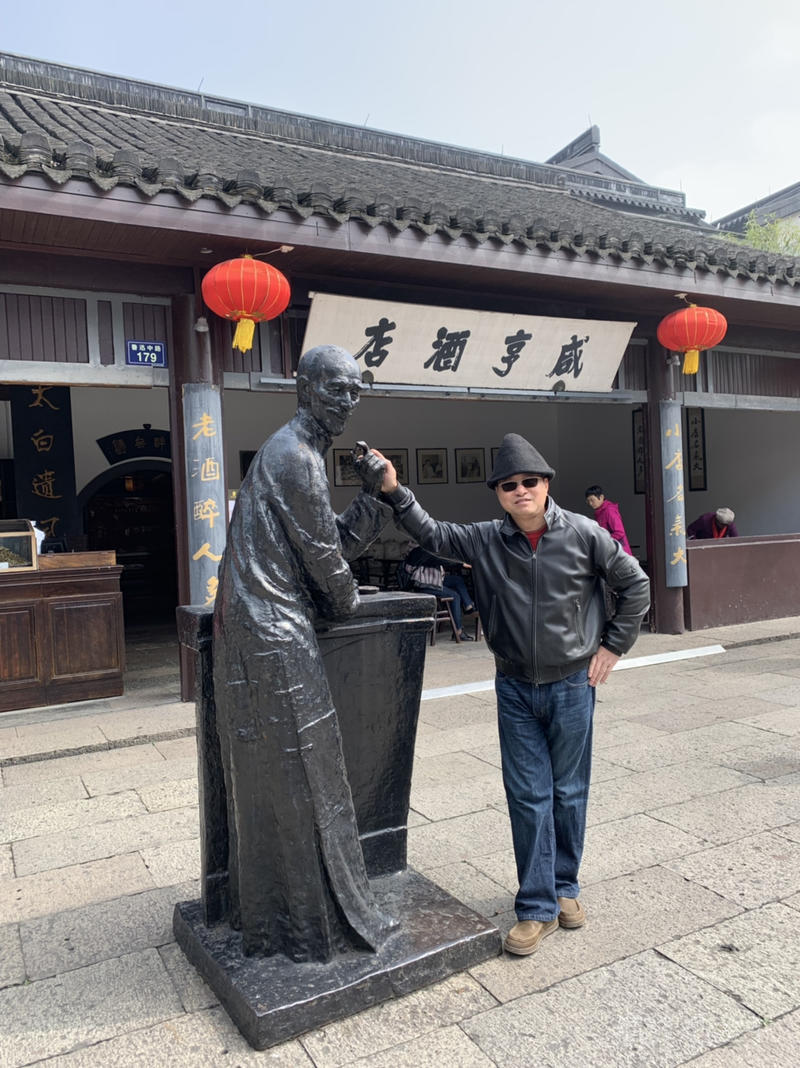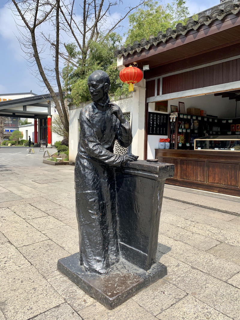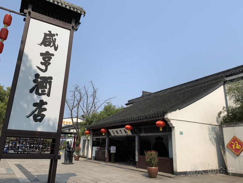 咸亨酒店在绍兴城内东昌坊口的东头,门口的雕塑是孔乙己立在柜台前喝黄酒,他就这么永远站在店门口,永远也喝不醉,引得游人纷纷与他合影。