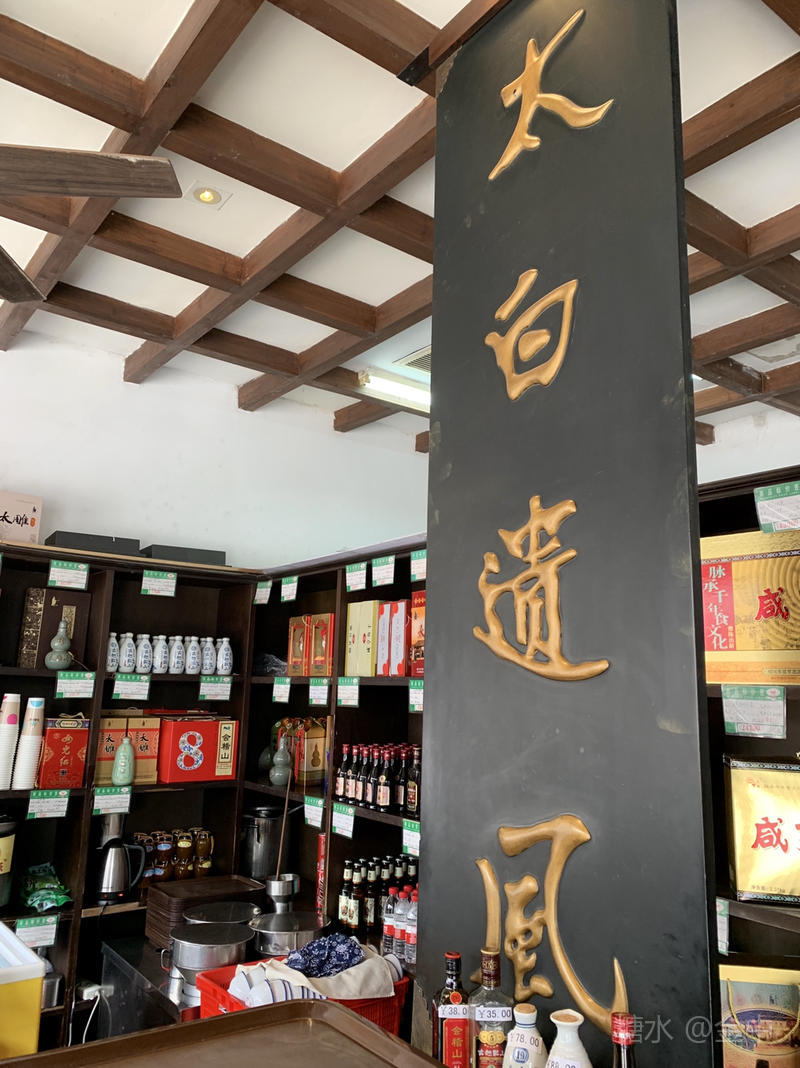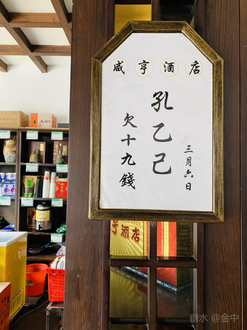晚清时的绍兴建筑风格如旧,屋沿下正中悬挂白底黑字的店匾,横书咸亨酒店四字。当街曲尺柜,柜上挂着太白遗风的青龙牌,牌下黄酒坛和蓝边碗,形成了独特风貌。孔乙己当年喝酒赊帐的欠条还挂在店中,成为永远追不回来钱的白条。