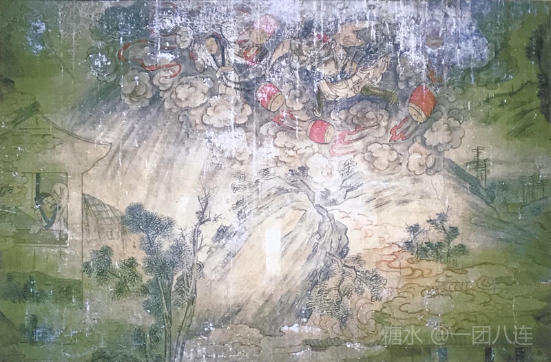 风雨司。壁画反映的是风雨欲来的场景,天上云中描绘的是雷公电母,雷公鸟头,人身,鸟腿,背部有羽翅,裸上身,脑后红发,周围有五个鼓。电母则女性打扮,双手举在空中,各持一镜,有红绸围绕。