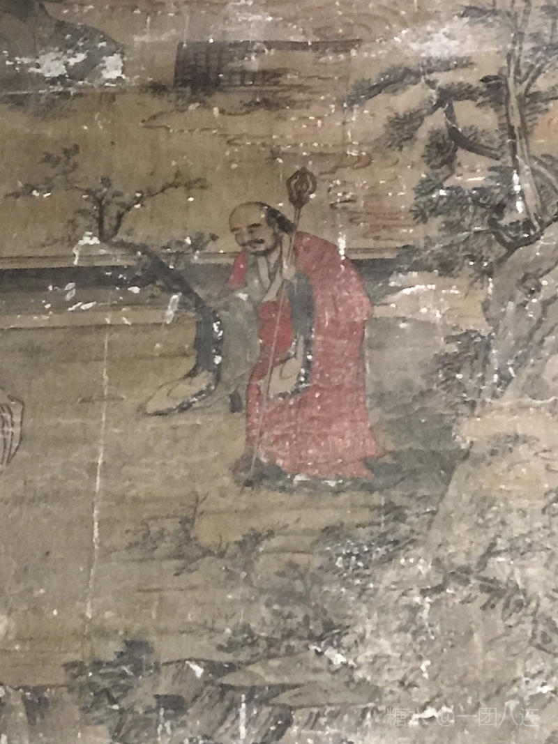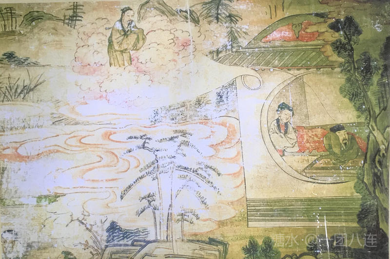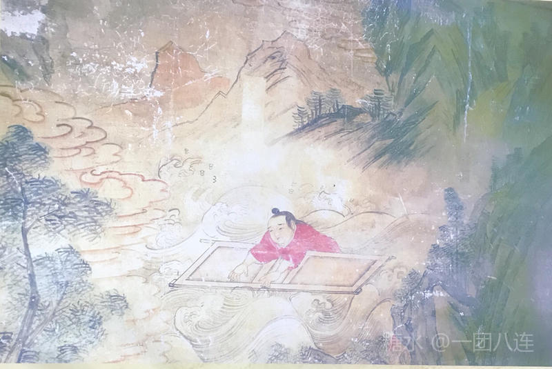 法水司。壁画中有一人在波涛汹涌的水里,头上扎一个发髻,身穿红衣,趴在一块门板上随波漂流,周围是山树云气。