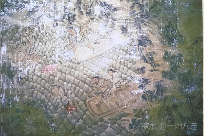 水怪司。壁画反映一个救援落水人员的场景,画中共有九人,二人落水,二人在岸上施救,五人在船上施救。水面波浪汹涌,场面紧张,扣人心弦。