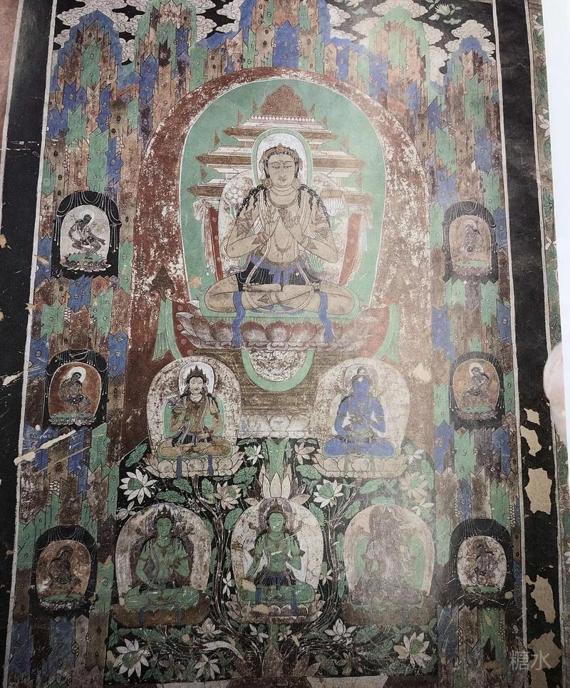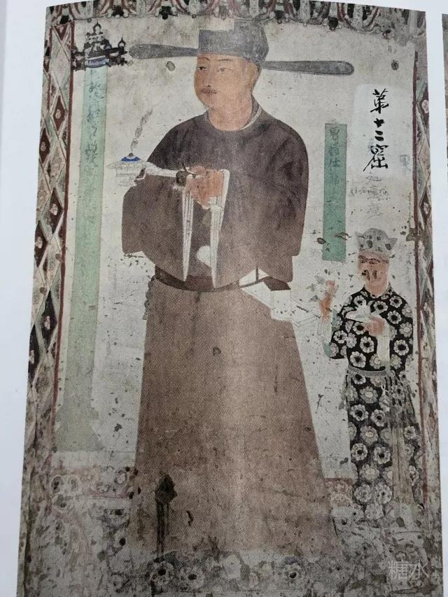 西窟33窟,佛教圣迹图,降魔变,地狱变,龙王赴会。 地狱变是过去少见的题材,画面中心人物是地藏,两侧画阎罗王审判……