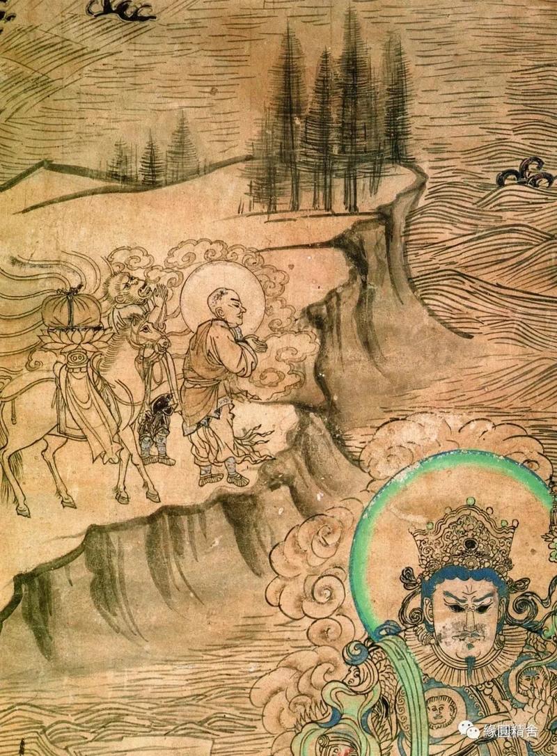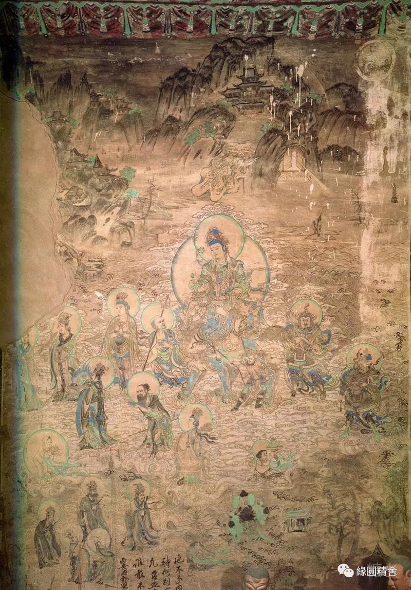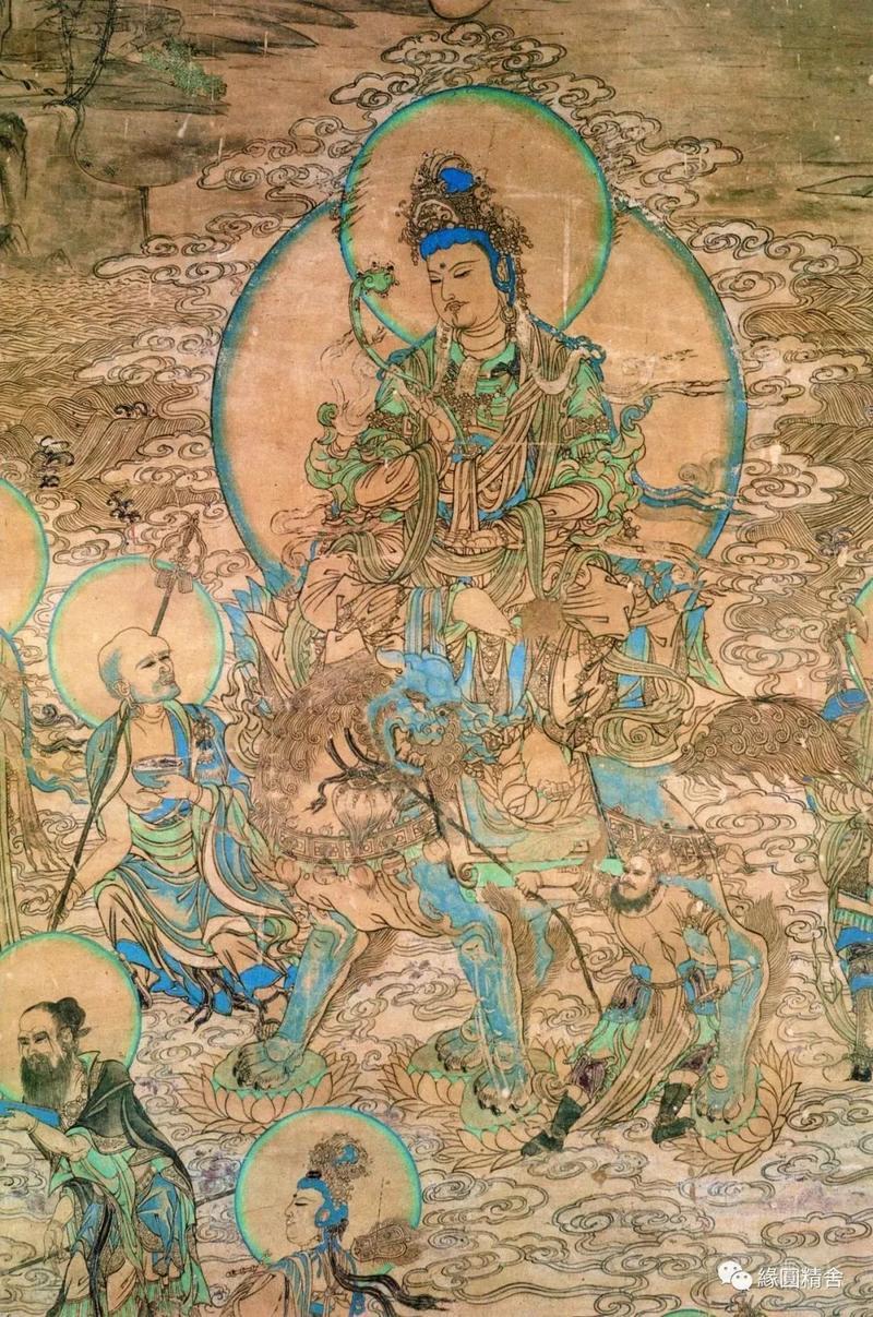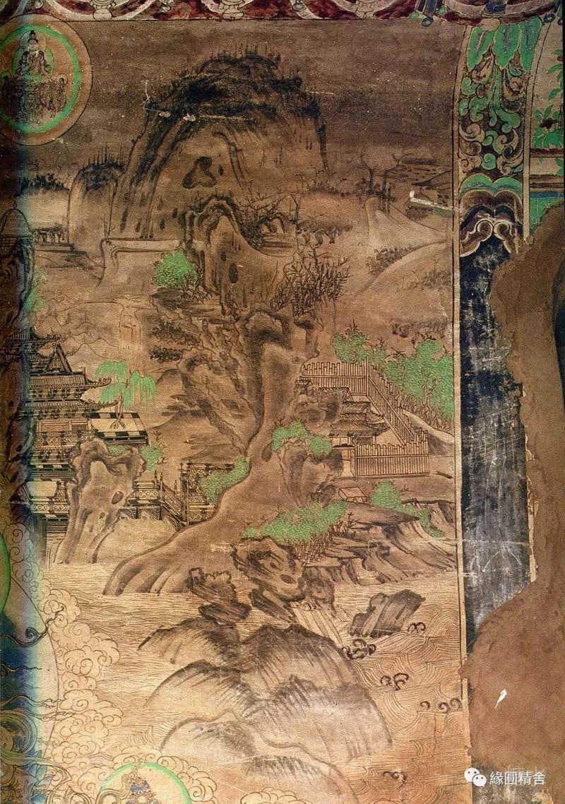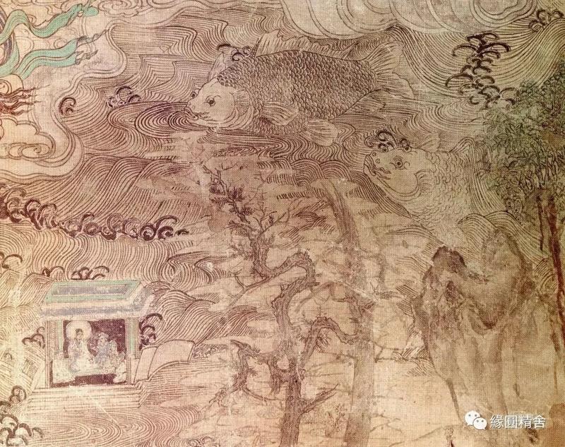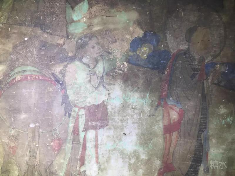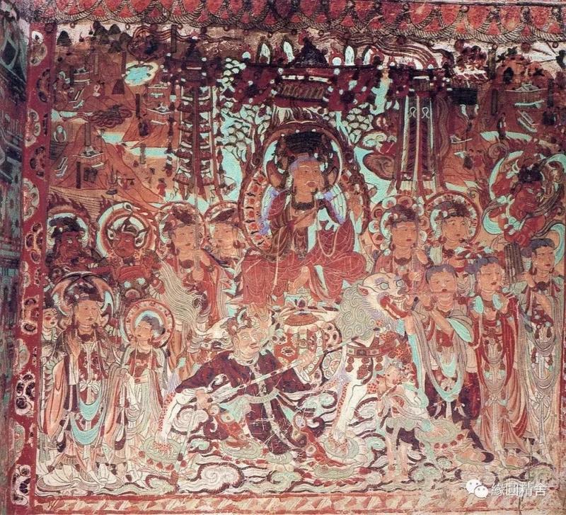 5号窟,文殊变,普贤变,描绘的较粗犷,塔侧婆罗树上倒挂的四只猴子🐒 在井中捞月。(图片待补充)