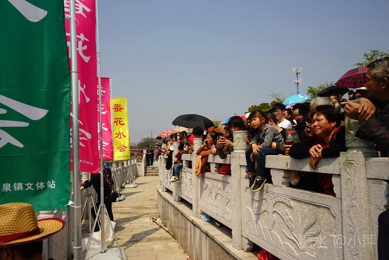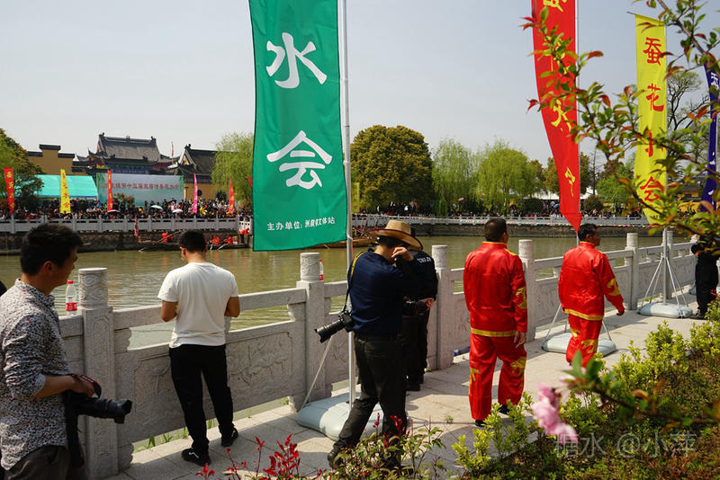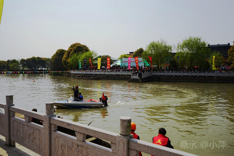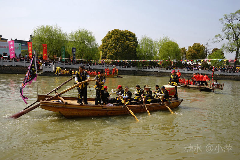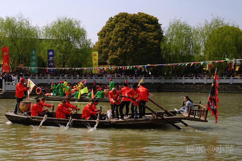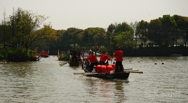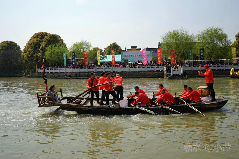 今天,去乡下扫墓,又遇上今年的“双庙渚·江南水上蚕花胜会”,这已是第十三届了。今天阳光高照,“蚕花胜会”现场依然人山人海,下午1点,一年一度的摇快船比赛正式开始,比赛共有8个村的快船队参与。