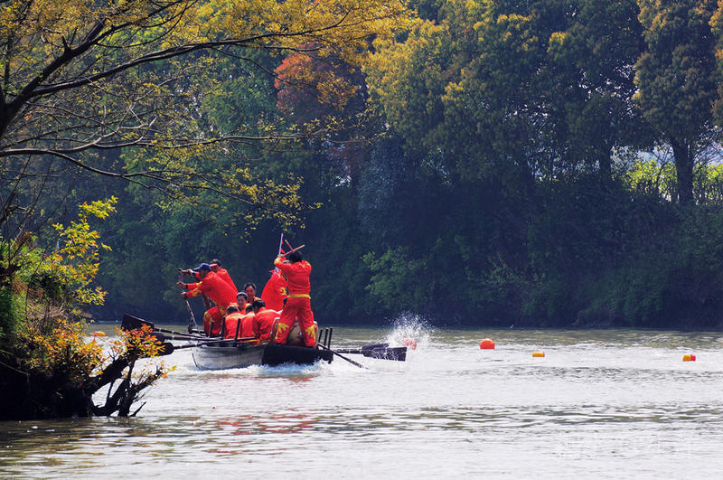 随着金鼓响起,场面即刻沸腾。远远望去,船上拨桨如飞,11名队员掌橹扯绷,从起点至终点往来如梭,争拔头筹。经过紧张激烈的比赛,决出了金奖银奖和铜奖。