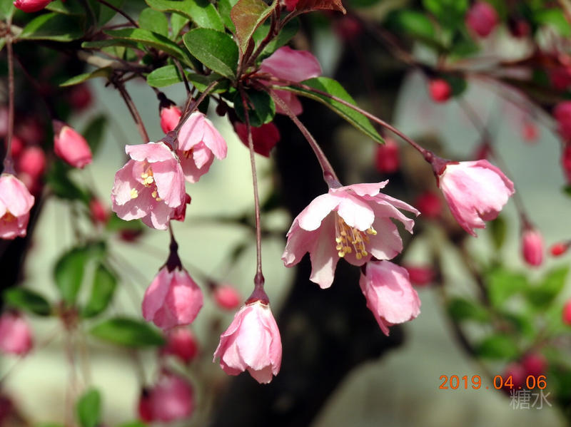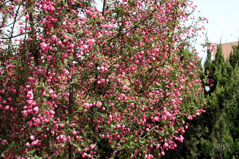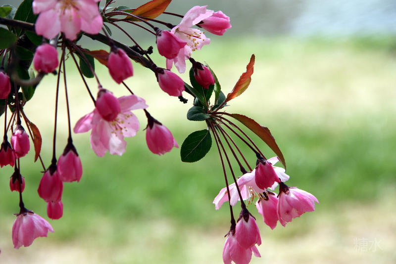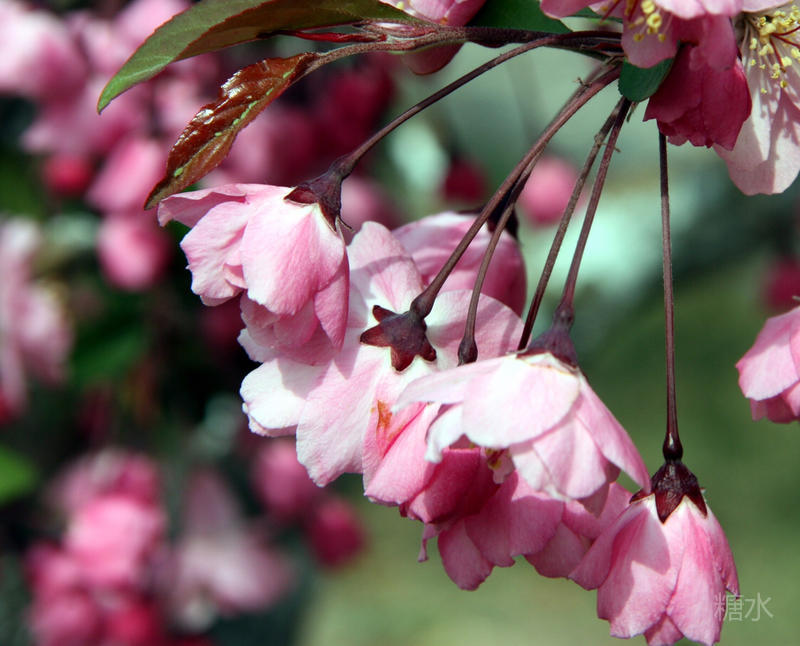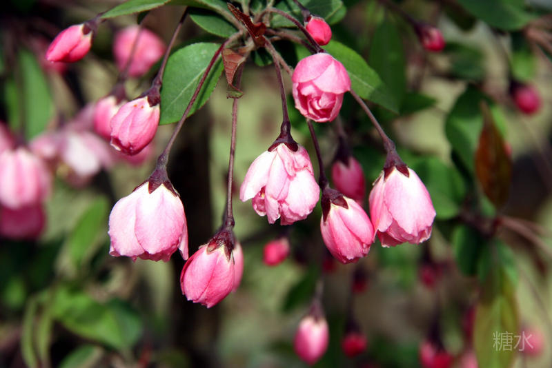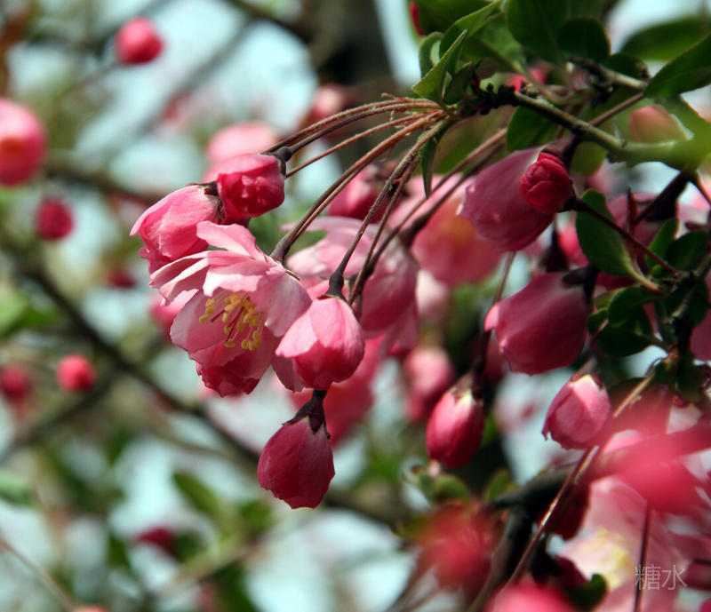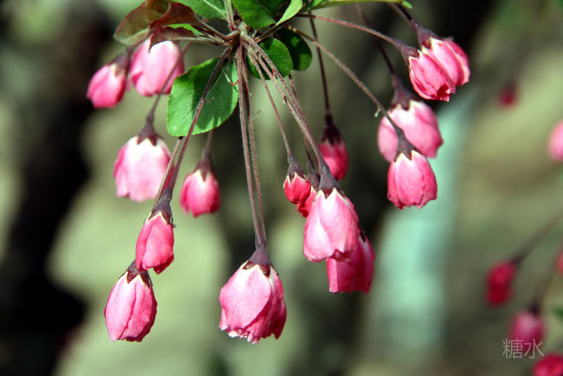 每到春天垂丝海棠开花的时节,那细柔的花蔓随着春风轻轻摇曳,似少女肌肤般红润的花朵低垂摆动,风姿绰绰,深情款款,楚楚动人。