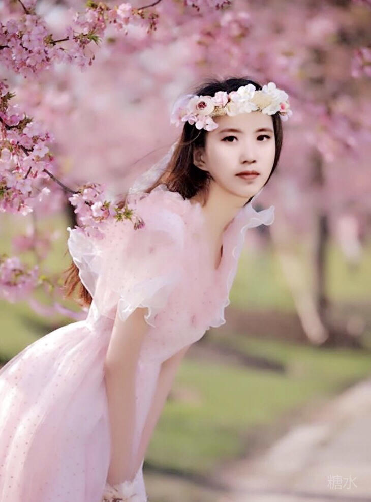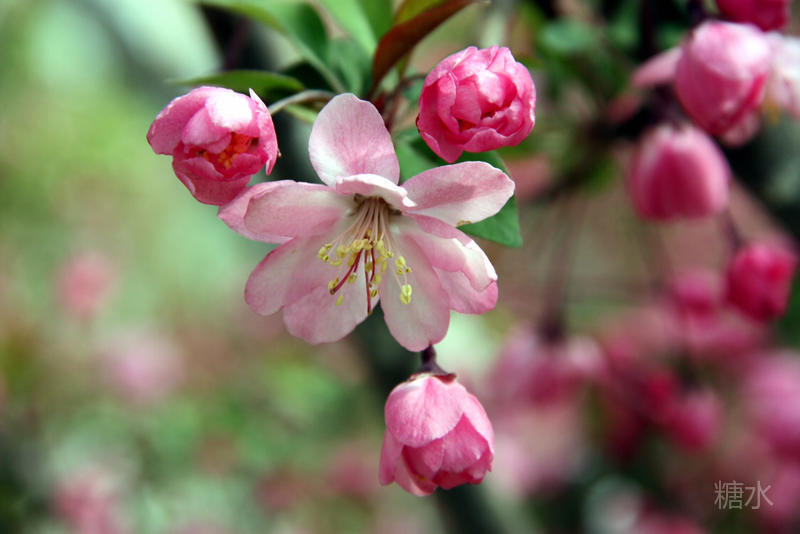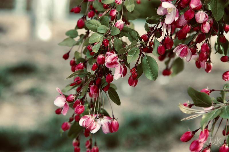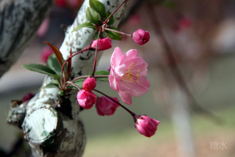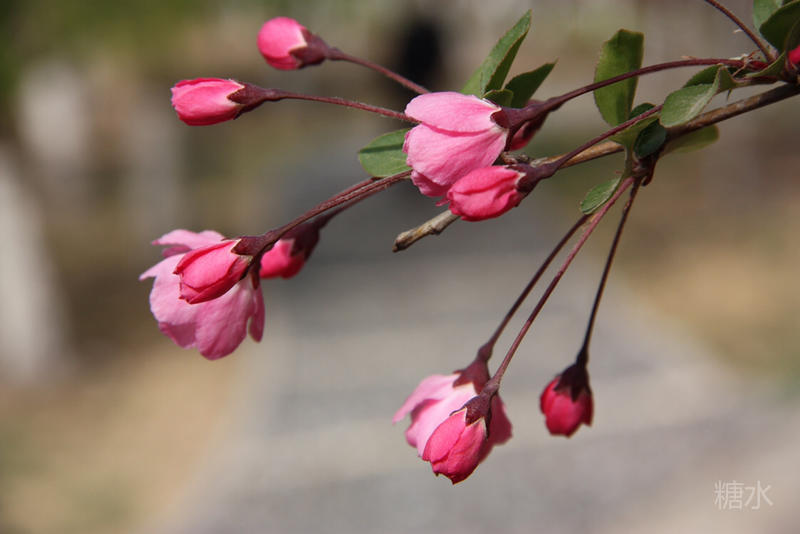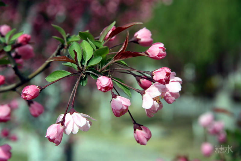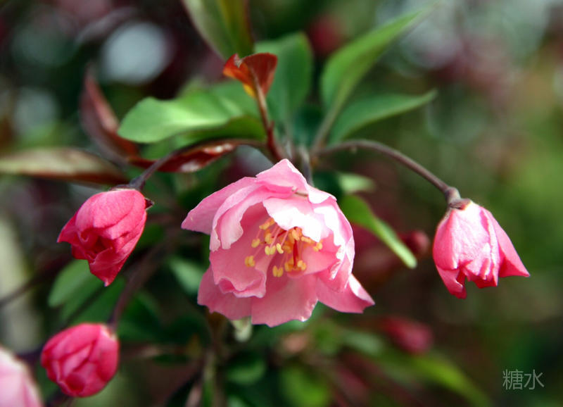 每到春天垂丝海棠开花的时节,那细柔的花蔓随着春风轻轻摇曳,似少女肌肤般红润的花朵低垂摆动,风姿绰绰,深情款款,楚楚动人。