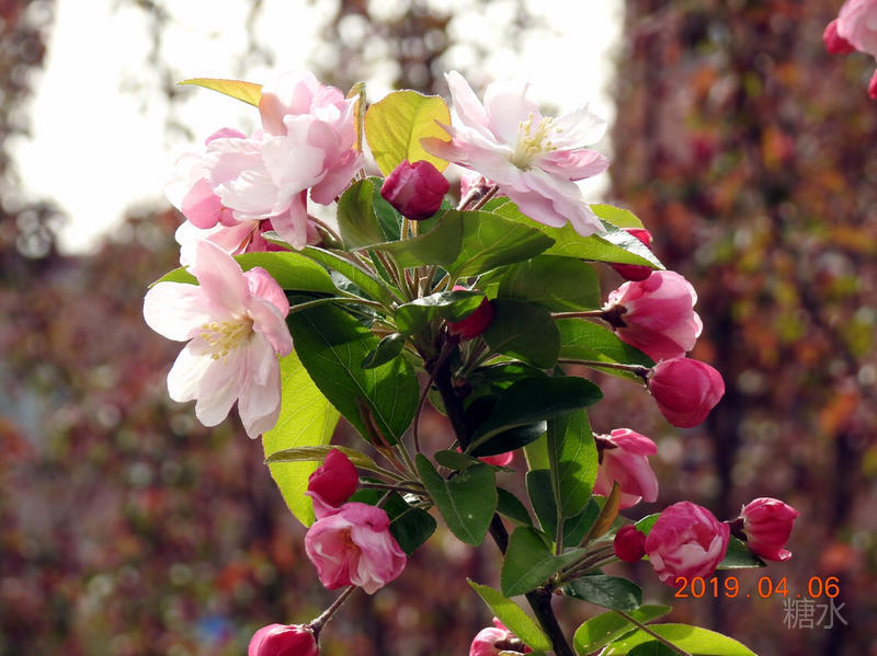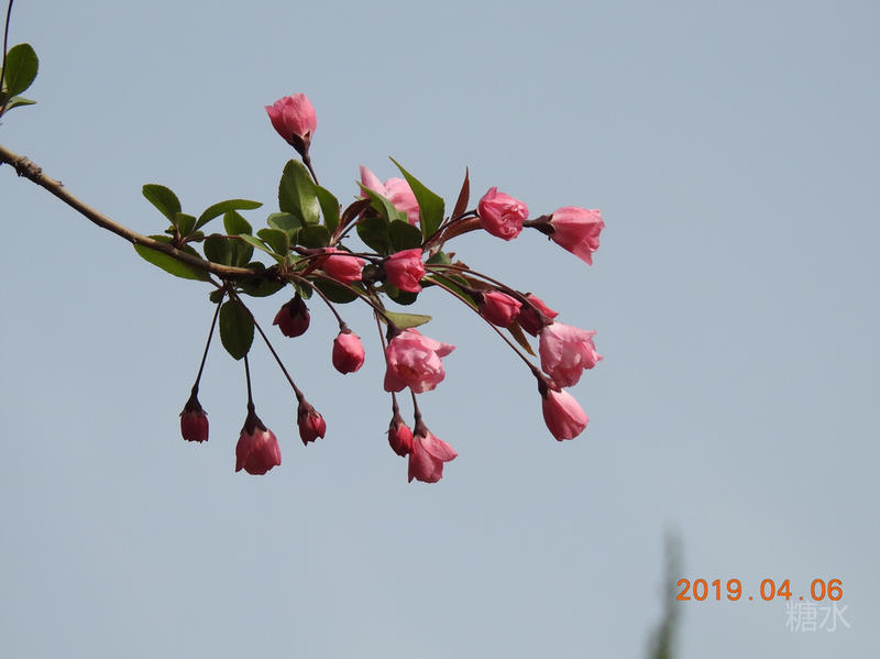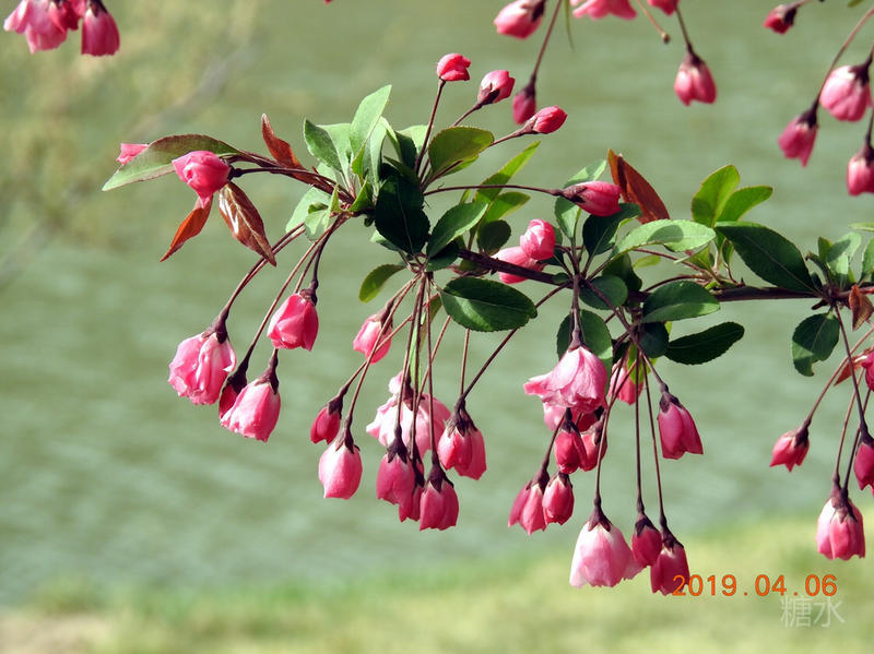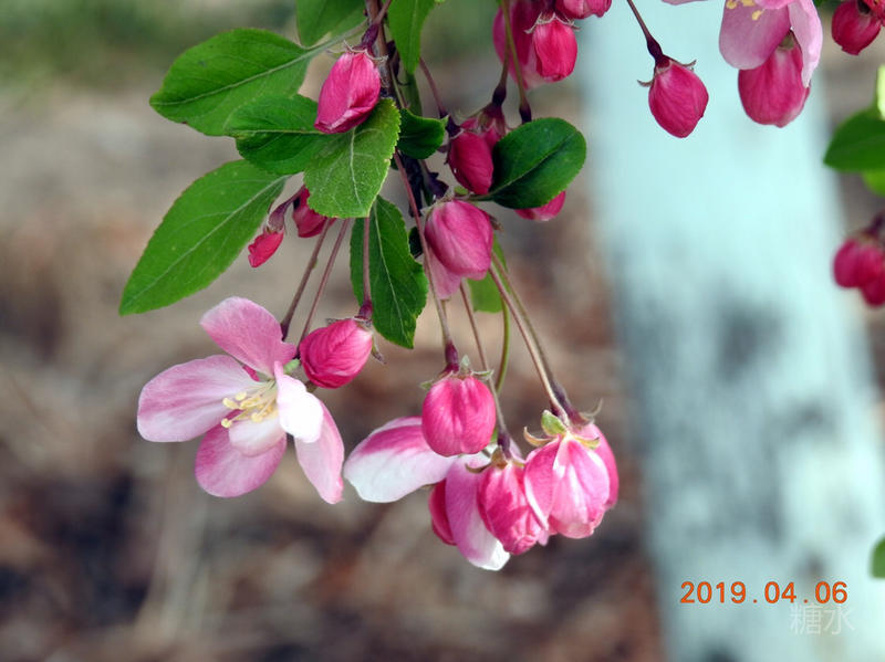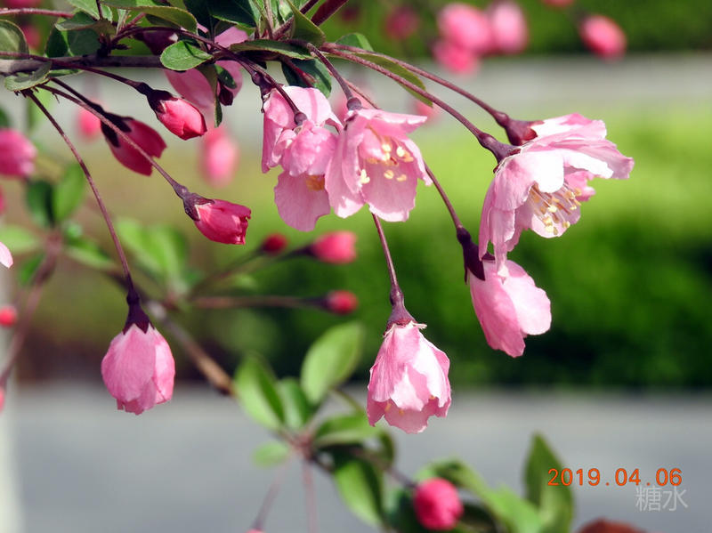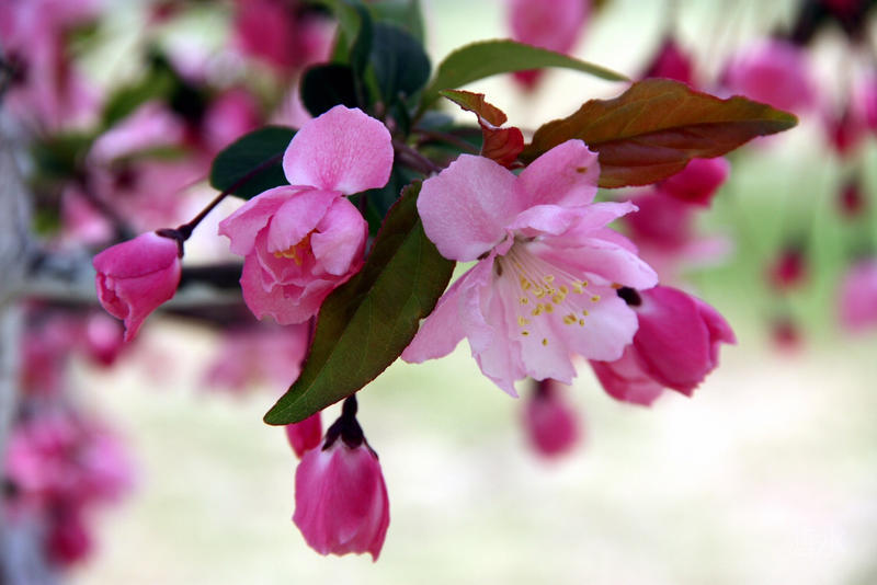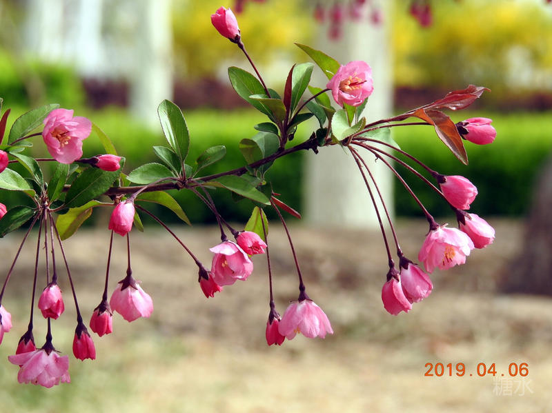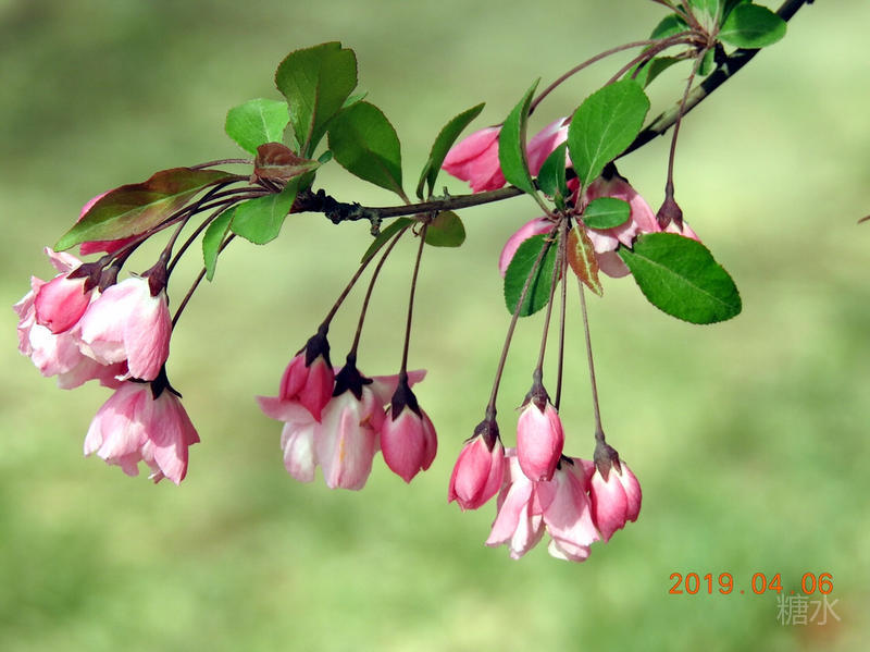 垂丝海棠的的花香,无“花”能及,淡淡的香味虽说不浓,但极其好闻,站在微风中看着眼前一株株垂丝海棠轻轻摆动,好像一个个可爱的精灵在窃窃私语,她们粉得那么自然又显得那么谦虚。我陶醉于眼前这一切。