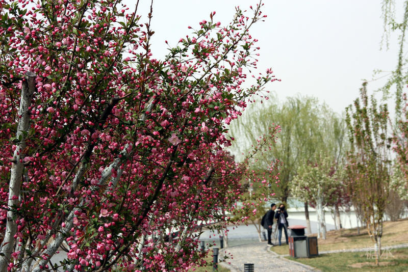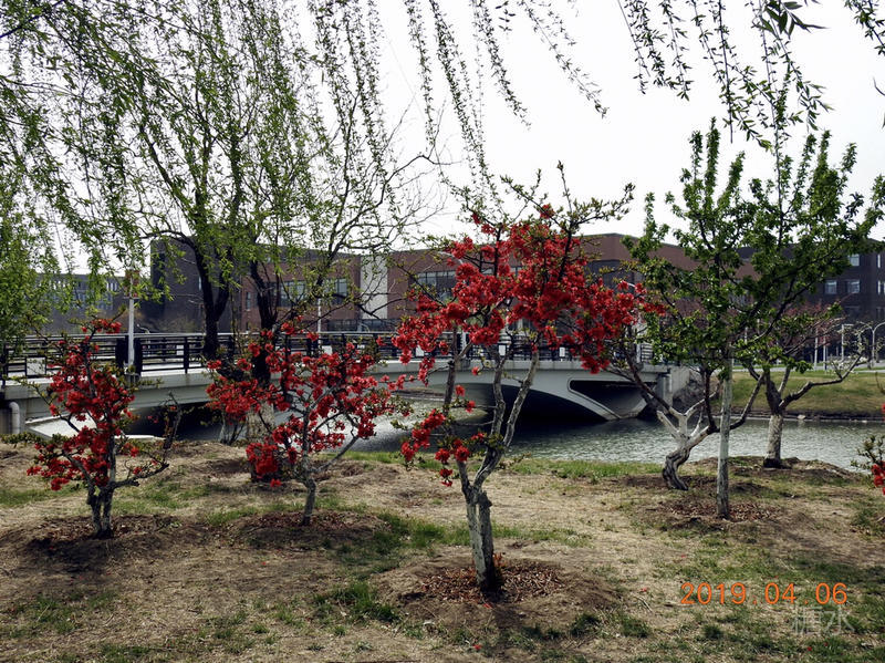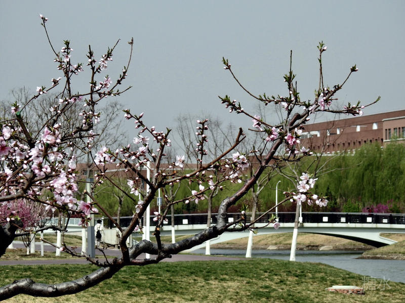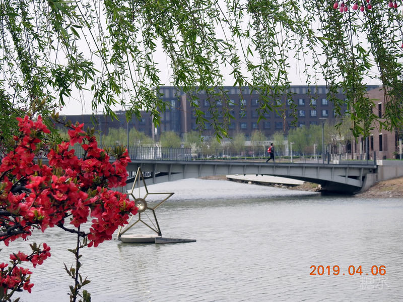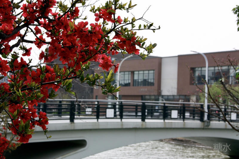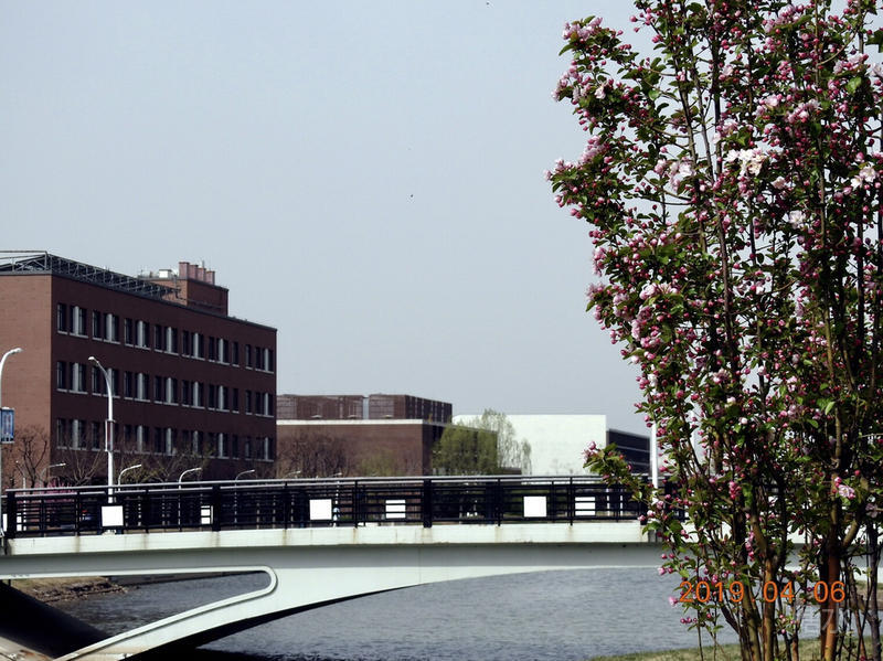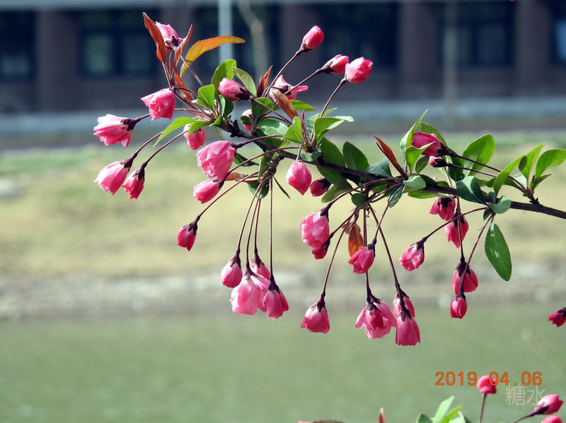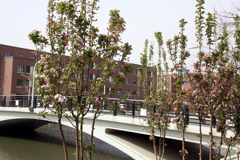 当天我们在拍摄垂丝海棠的同时,还拍摄了一组海棠提岸的校景,新校区美丽宁静、水景清新、高端大气、花红柳绿,媲美老校区,甚至更胜一筹。