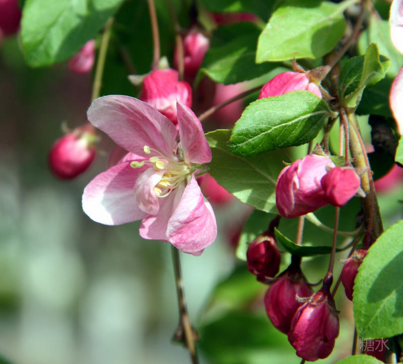 垂丝海棠开花有早有迟,在同一株树上,能看到花开的各种形态,有的含羞待放,粉红的花苞鲜嫩可爱;有的刚刚绽放,像一位害羞的姑娘,偷偷地向外看着。盛开着的海棠花那粉色的花瓣层层叠叠,露出中间金色的花蕊,惹人喜爱。先前开过的垂丝海棠花瓣虽然凋谢了,花蕊依然挺立枝头。