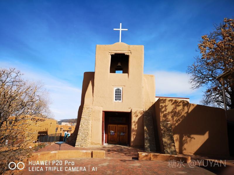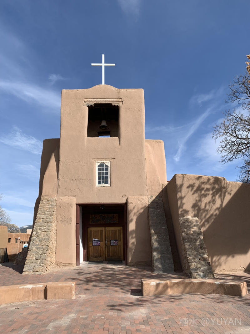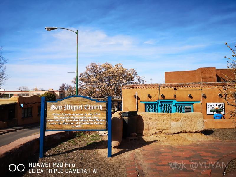 圣米格尔传教会 (San Miguel Mission),西班牙文为:Misión de San Miguel, 又名圣米格尔教堂(San Miguel Chapel)。 西班牙殖民统治时期建筑风格的教堂。它建于1610年至1626年间,是美国大陆最古老的教堂。该教堂在1680年普韦布洛起义期间遭到破坏,但在西班牙重新征服后于1710年重建,曾作为西班牙士兵的礼拜堂服务了一段时间。教堂几经修缮,尽管被后置的砖墙遮盖着,原本的古老的土坯墙 (Adobe), 但是实际上,基本完好无损!