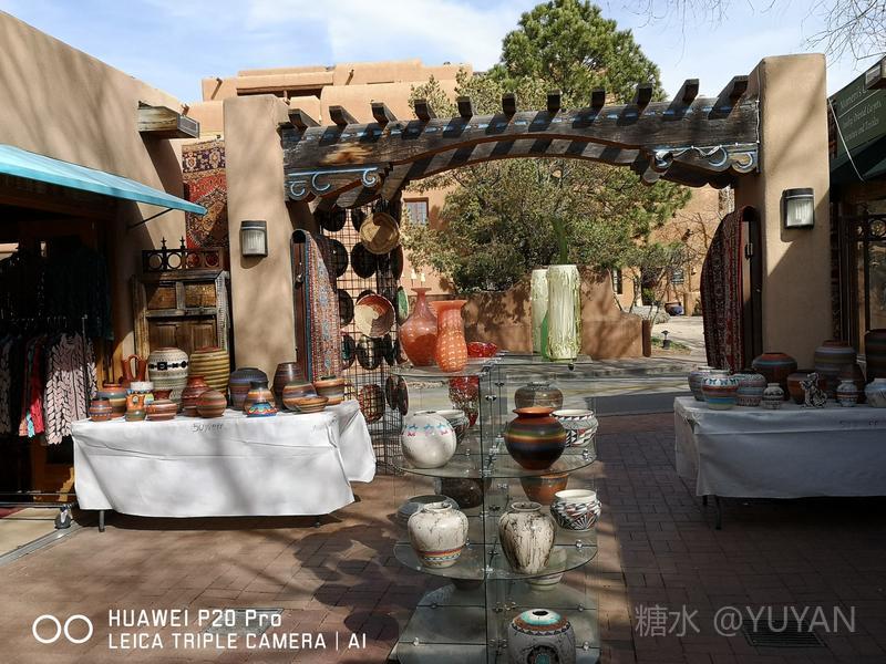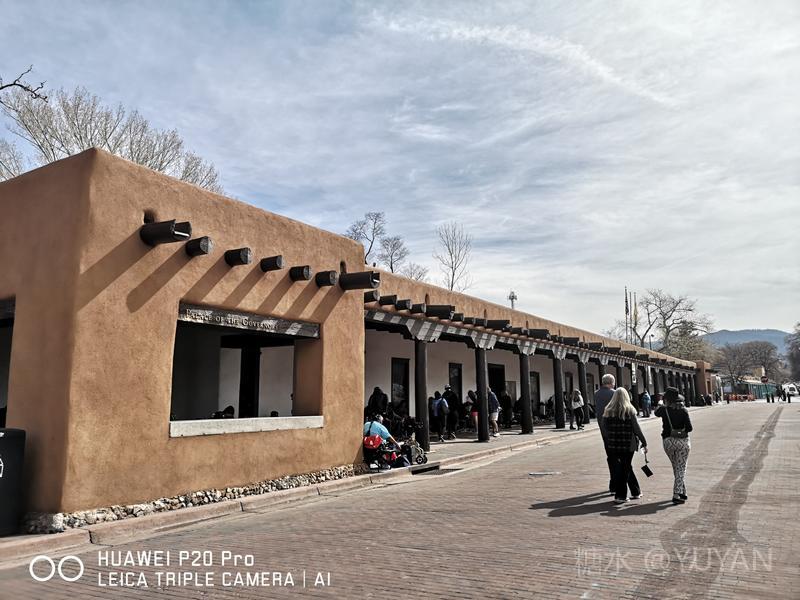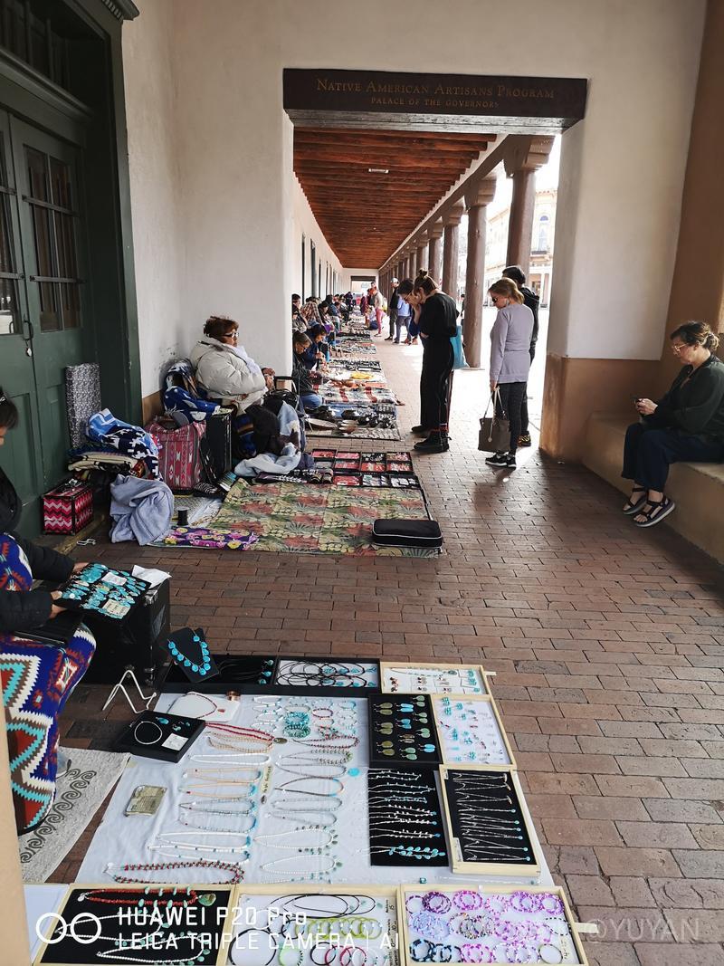 Santa Fe Plaza 北面的 Palace of Governors是殖民地时代西班牙总督的办公地点,建于1609年,是美国最古老的行政楼,典型的Adobe(土坯)建筑。现在成为当地百姓和手工艺者摆地摊的场所。