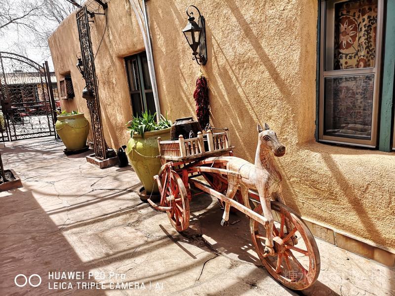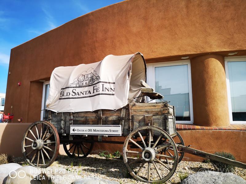 “老圣塔菲饭店”的门前的摆放着一辆西部大开发时期的布蓬马车。
