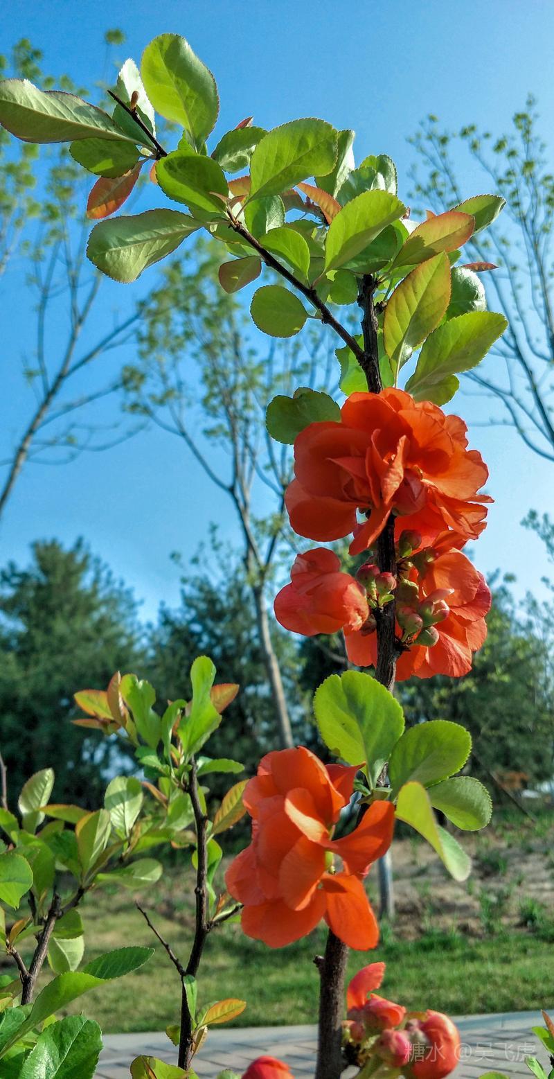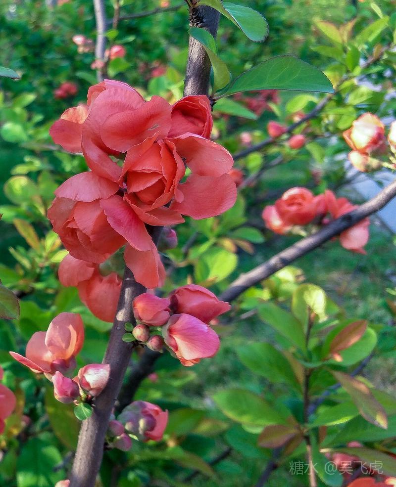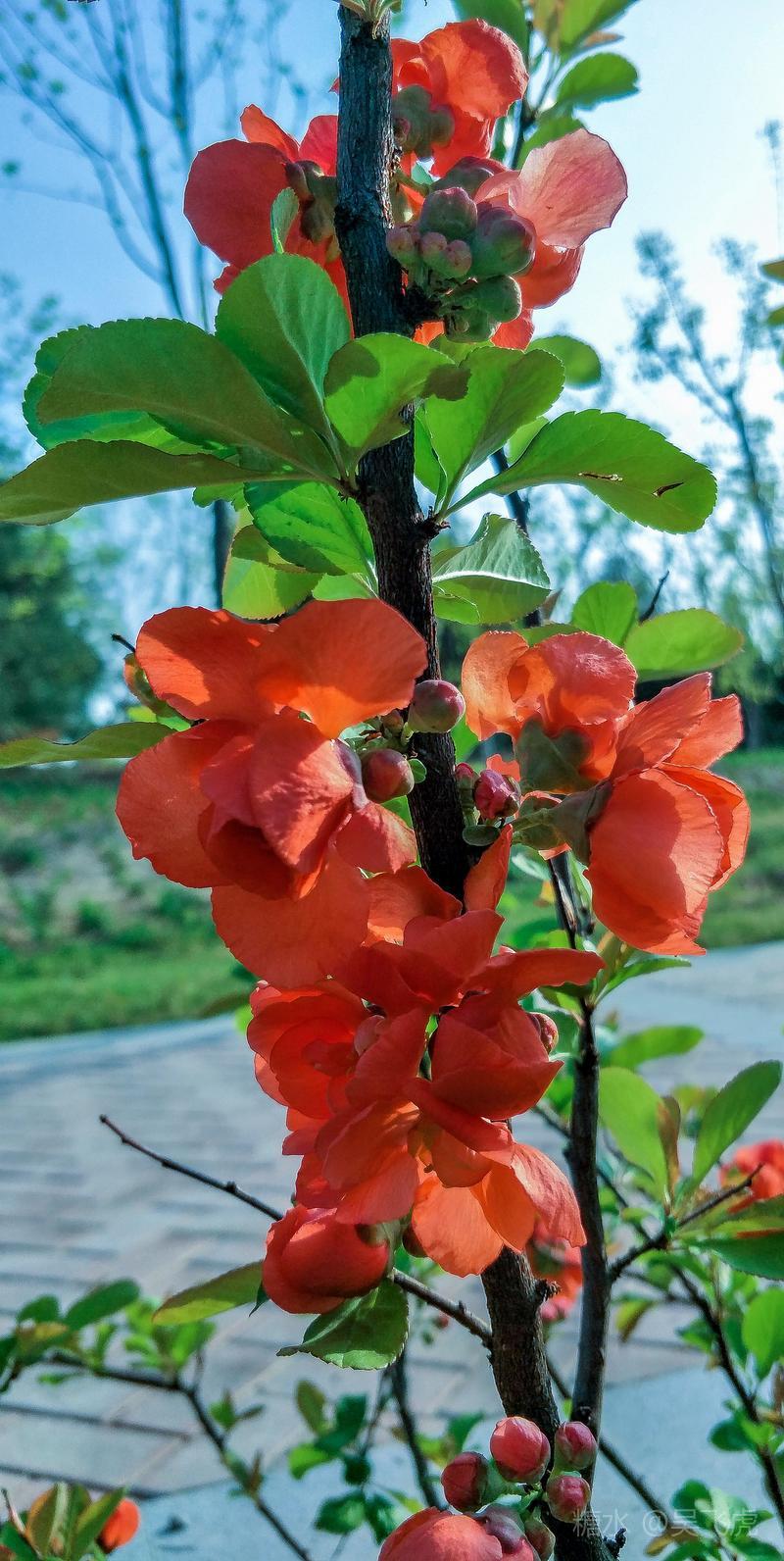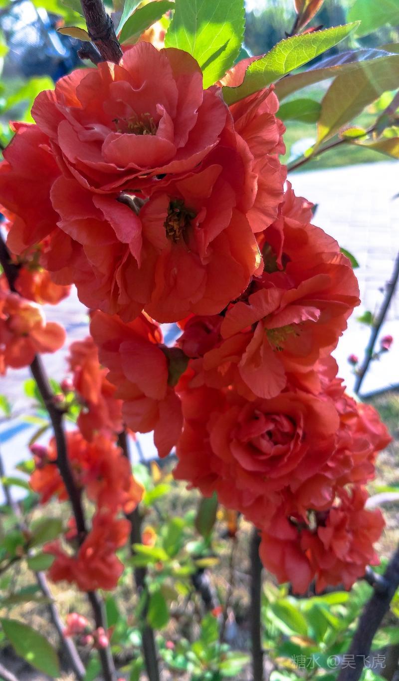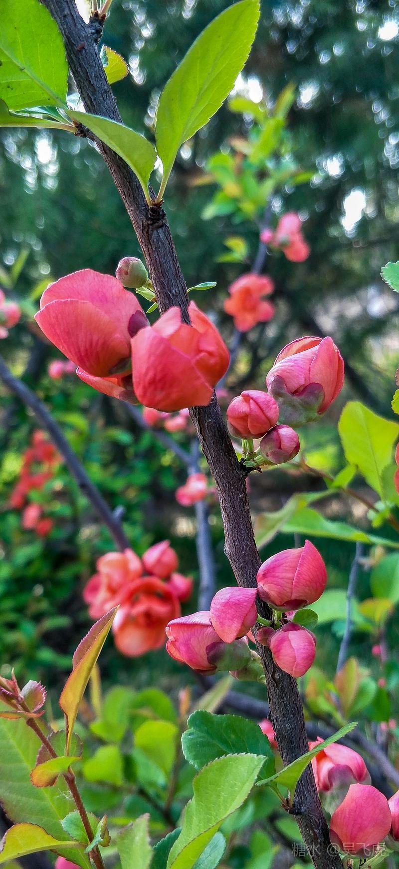 贴梗海棠,是蔷薇科木瓜属植物,其枝秆丛生,枝上有刺,其花梗极短,花朵紧贴在枝干上,故名。其花朵鲜润丰腴、绚烂耀目,是庭园中主要春季花木之一,既可在园林中单株栽植布置花境,亦可成行栽植作花篱,又可作盆栽观赏,是理想的花果树桩盆景材料。在太原迎新街区以西的南固碾村,沿着村头的主干道一直向西走,在临近滨河东路的黄土地上,村民们兴建了一所滨河公园。公园面积不小,绿化工作已经初具规模,贴梗海棠正在盛开之时,花红叶翠,煞是一道园中漂亮的风景线!只可惜没有带相机,只能用手机随拍了一些,供您浏览分享。