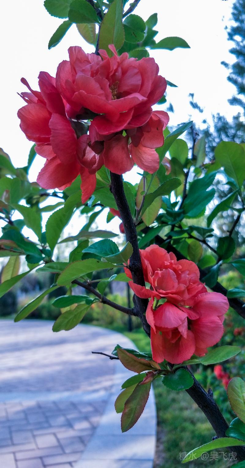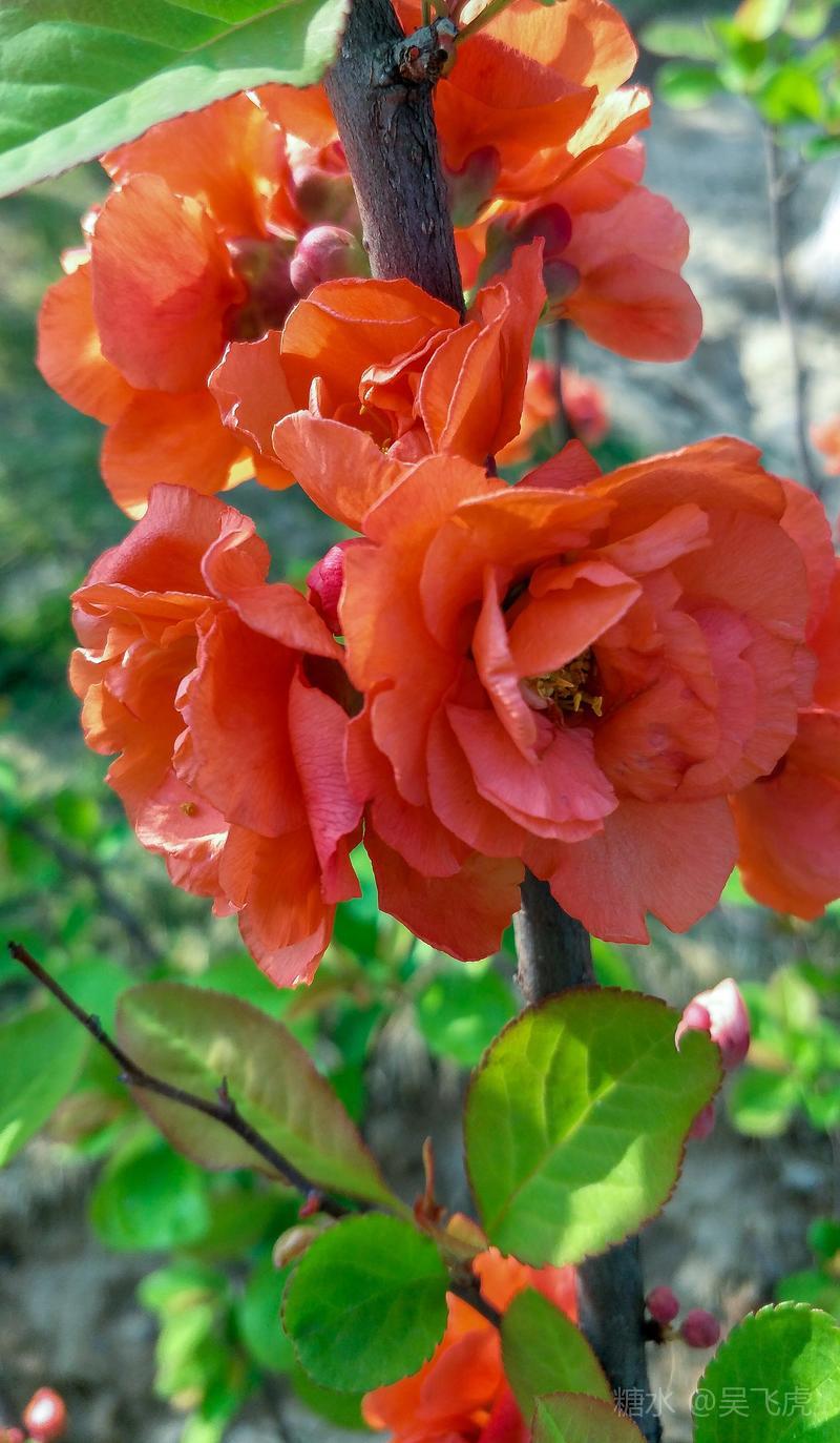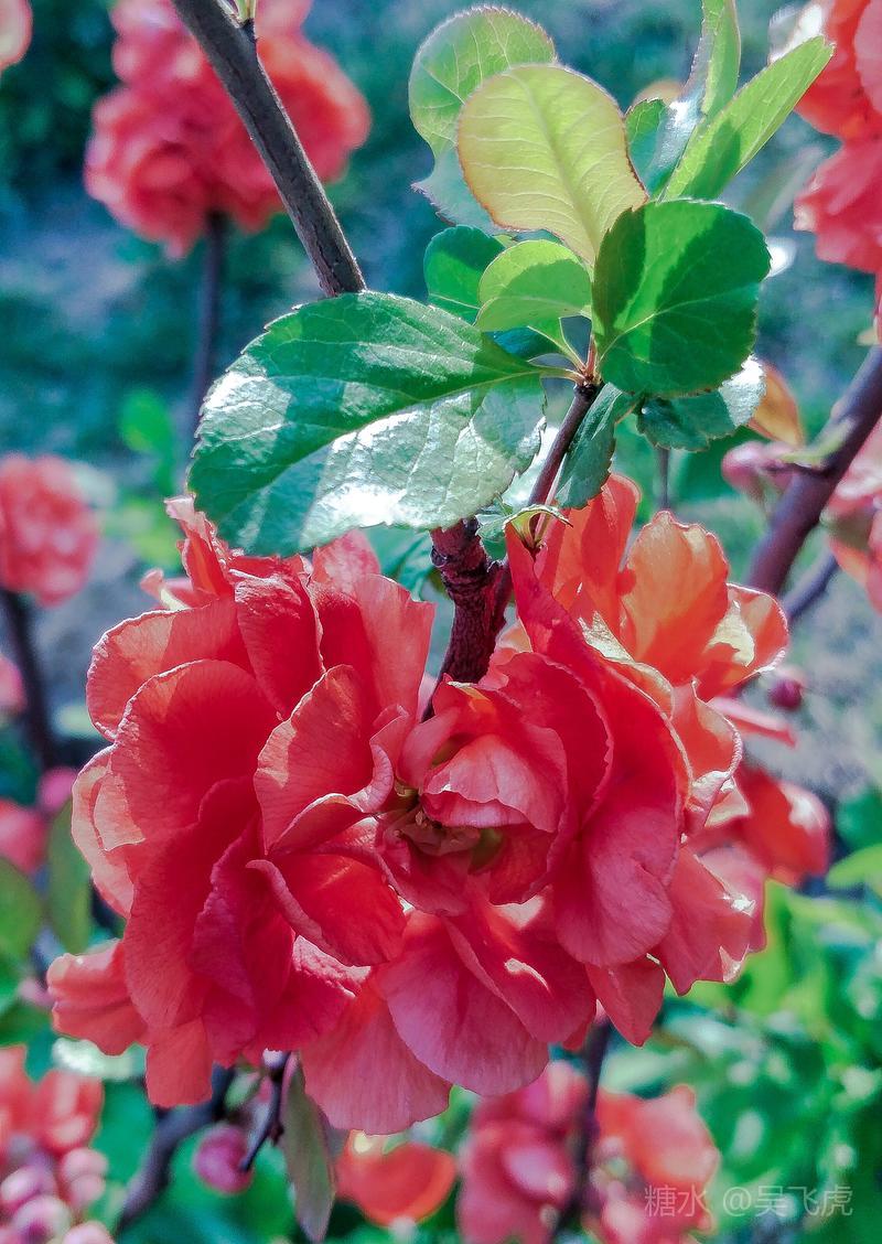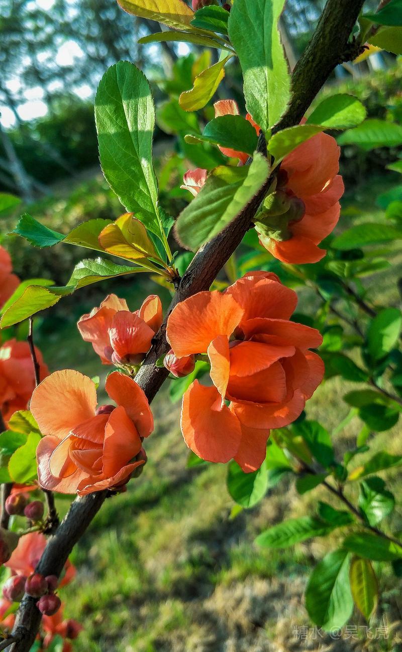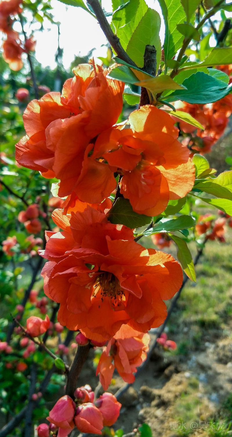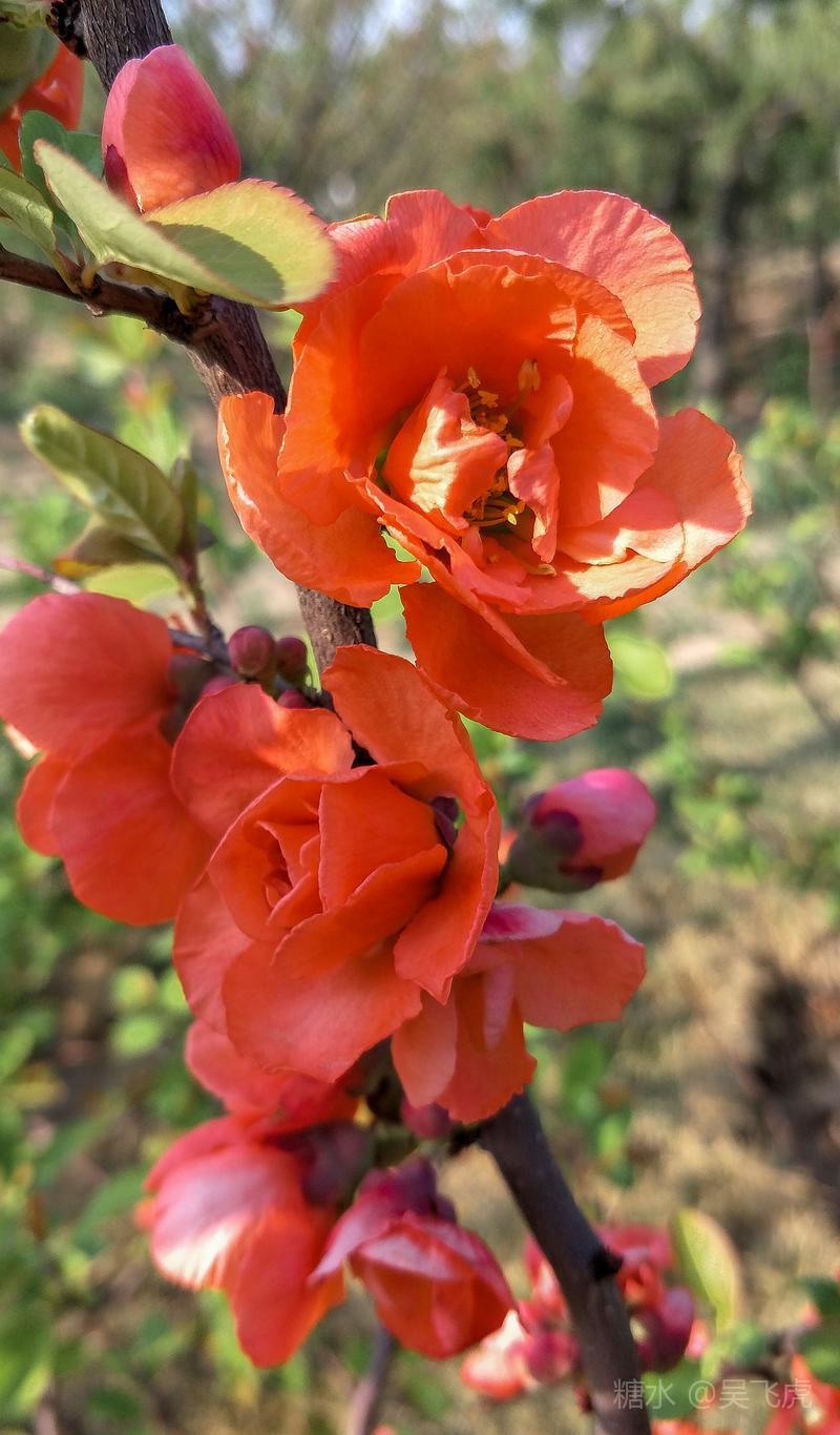 贴梗海棠,是蔷薇科木瓜属植物,其枝秆丛生,枝上有刺,其花梗极短,花朵紧贴在枝干上,故名。其花朵鲜润丰腴、绚烂耀目,是庭园中主要春季花木之一,既可在园林中单株栽植布置花境,亦可成行栽植作花篱,又可作盆栽观赏,是理想的花果树桩盆景材料。在太原迎新街区以西的南固碾村,沿着村头的主干道一直向西走,在临近滨河东路的黄土地上,村民们兴建了一所滨河公园。公园面积不小,绿化工作已经初具规模,贴梗海棠正在盛开之时,花红叶翠,煞是一道园中漂亮的风景线!只可惜没有带相机,只能用手机随拍了一些,供您浏览分享。