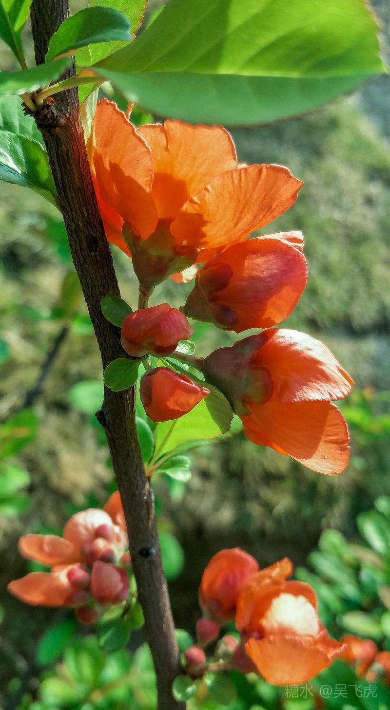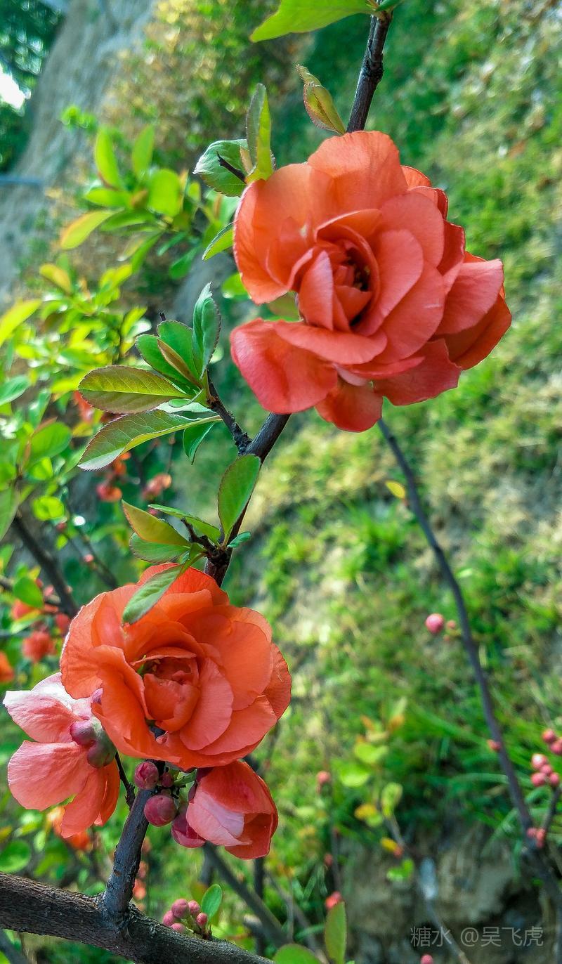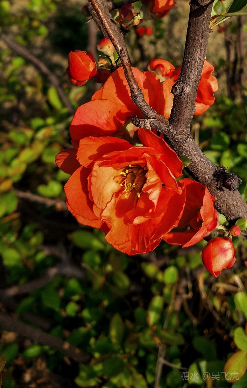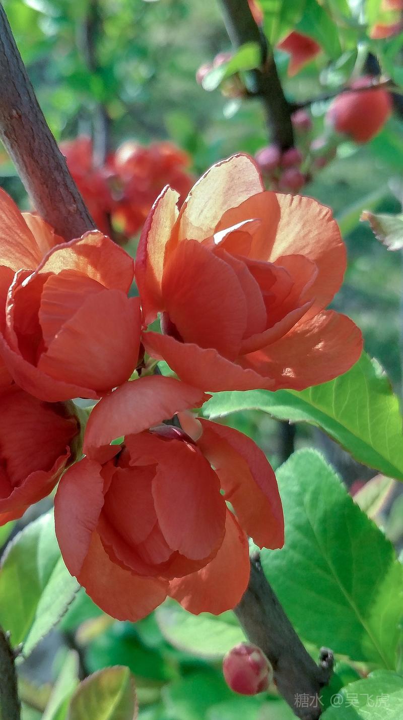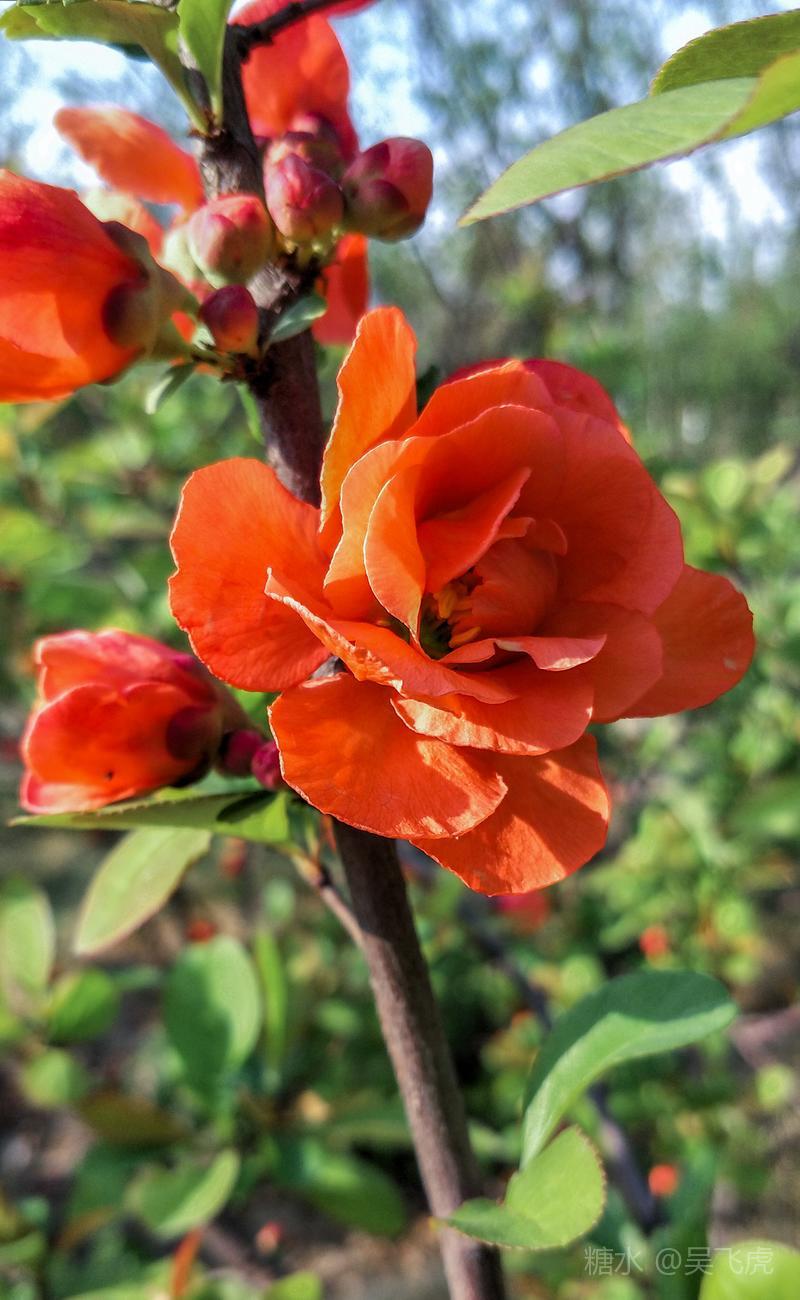贴梗海棠,是蔷薇科木瓜属植物,其枝秆丛生,枝上有刺,其花梗极短,花朵紧贴在枝干上,故名。其花朵鲜润丰腴、绚烂耀目,是庭园中主要春季花木之一,既可在园林中单株栽植布置花境,亦可成行栽植作花篱,又可作盆栽观赏,是理想的花果树桩盆景材料。在太原迎新街区以西的南固碾村,沿着村头的主干道一直向西走,在临近滨河东路的黄土地上,村民们兴建了一所滨河公园。公园面积不小,绿化工作已经初具规模,贴梗海棠正在盛开之时,花红叶翠,煞是一道园中漂亮的风景线!只可惜没有带相机,只能用手机随拍了一些,供您浏览分享。