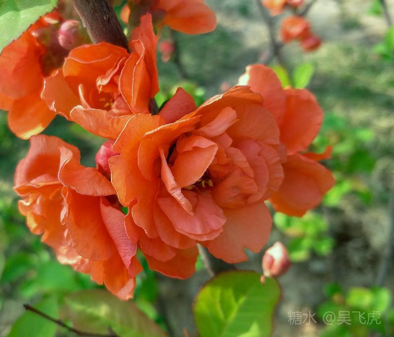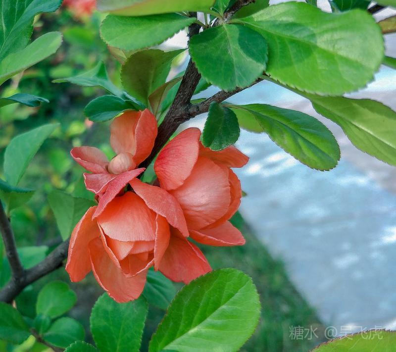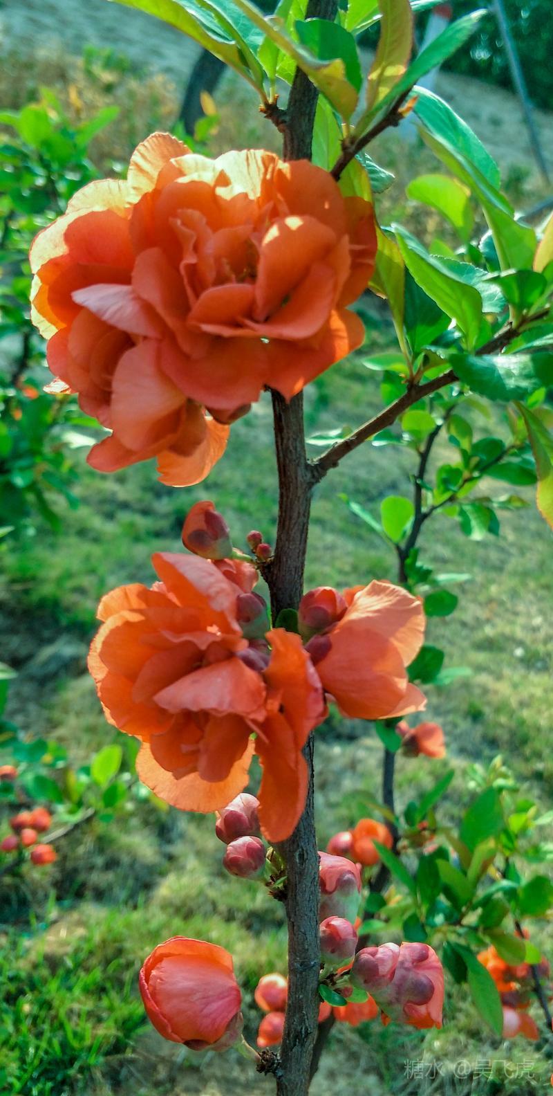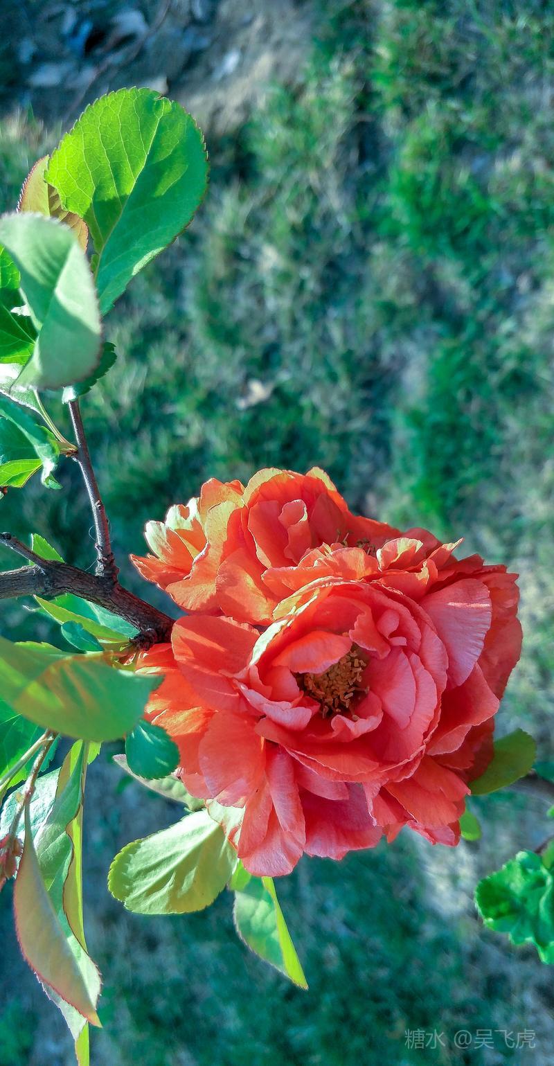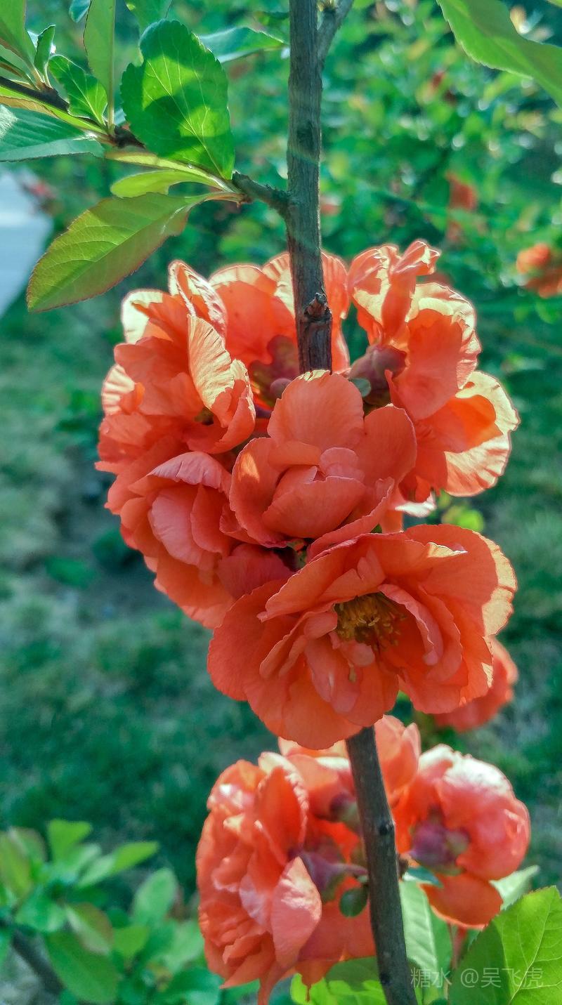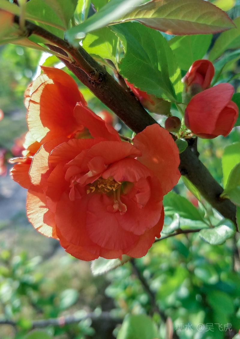 贴梗海棠,是蔷薇科木瓜属植物,其枝秆丛生,枝上有刺,其花梗极短,花朵紧贴在枝干上,故名。其花朵鲜润丰腴、绚烂耀目,是庭园中主要春季花木之一,既可在园林中单株栽植布置花境,亦可成行栽植作花篱,又可作盆栽观赏,是理想的花果树桩盆景材料。在太原迎新街区以西的南固碾村,沿着村头的主干道一直向西走,在临近滨河东路的黄土地上,村民们兴建了一所滨河公园。公园面积不小,绿化工作已经初具规模,贴梗海棠正在盛开之时,花红叶翠,煞是一道园中漂亮的风景线!只可惜没有带相机,只能用手机随拍了一些,供您浏览分享。