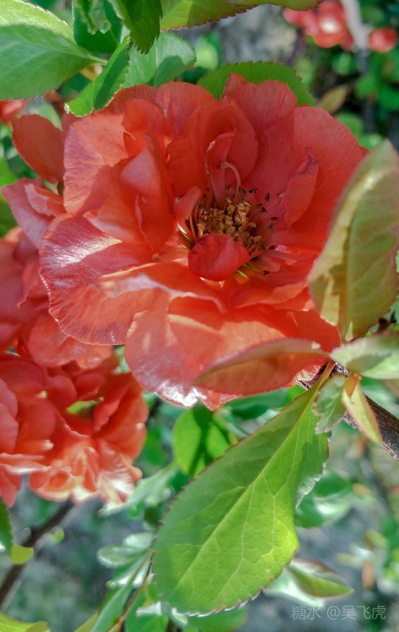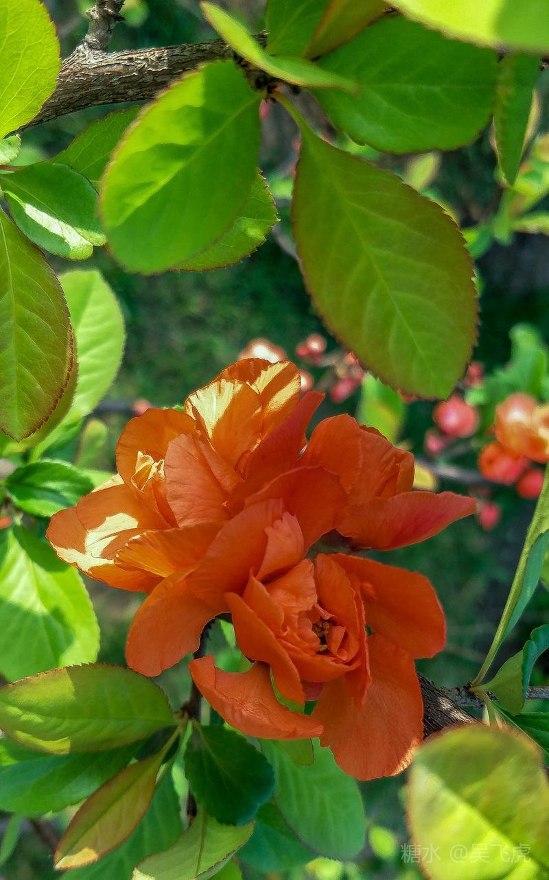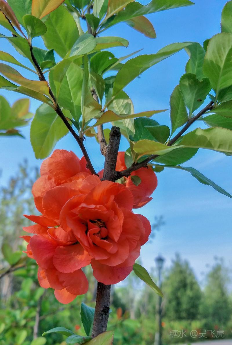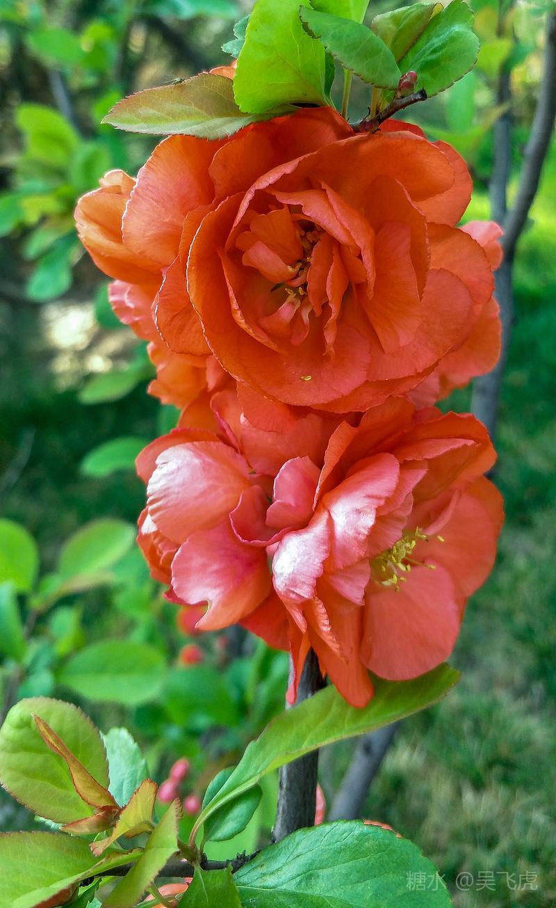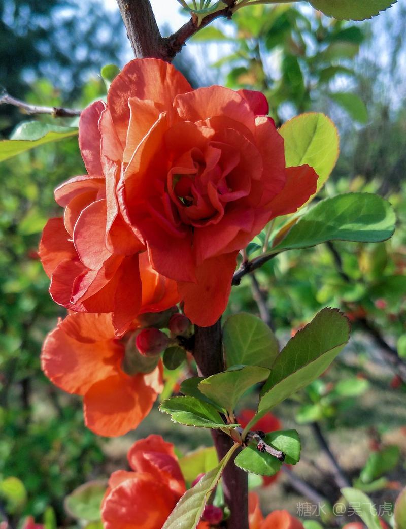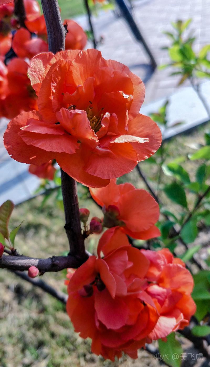 贴梗海棠,是蔷薇科木瓜属植物,其枝秆丛生,枝上有刺,其花梗极短,花朵紧贴在枝干上,故名。其花朵鲜润丰腴、绚烂耀目,是庭园中主要春季花木之一,既可在园林中单株栽植布置花境,亦可成行栽植作花篱,又可作盆栽观赏,是理想的花果树桩盆景材料。在太原迎新街区以西的南固碾村,沿着村头的主干道一直向西走,在临近滨河东路的黄土地上,村民们兴建了一所滨河公园。公园面积不小,绿化工作已经初具规模,贴梗海棠正在盛开之时,花红叶翠,煞是一道园中漂亮的风景线!只可惜没有带相机,只能用手机随拍了一些,供您浏览分享。