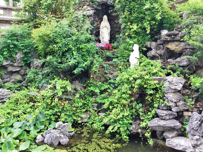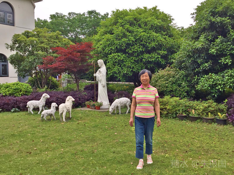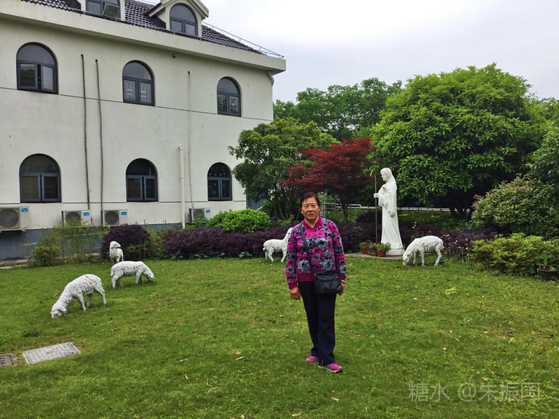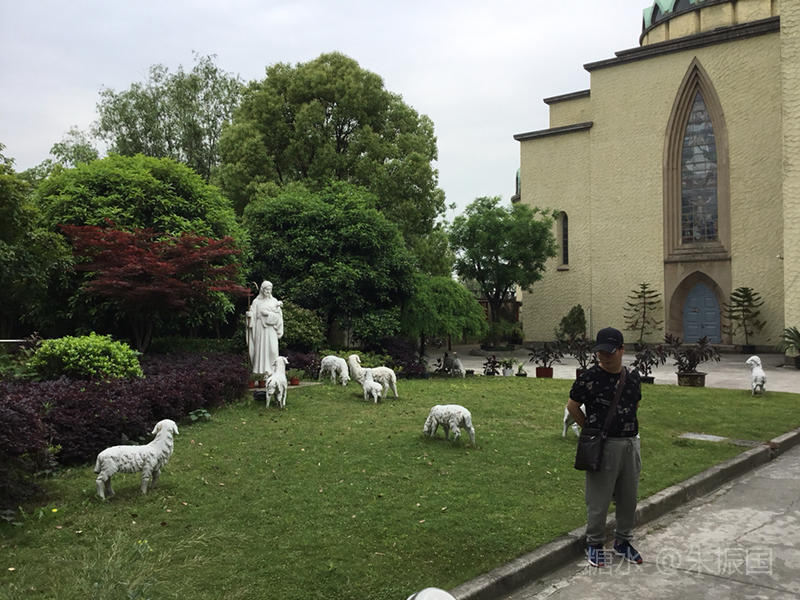 耶稣怀抱羊羔的雕塑就耸立教堂外的草地上,还有一群羊围在他的身前。
