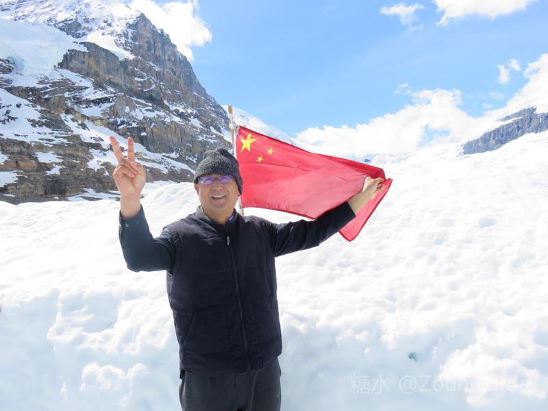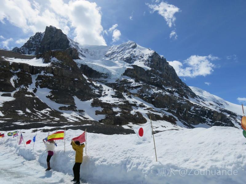 登上冰原的旅客,来自世界各地。和我同乘一辆大轮冰车的,是一个近20人的美国旅游团。令我惊讶的全部是七八十岁以上的老人,最年长的看上去近九十岁,行动已有些不便,每次上下车都要靠人扶持。如此老人都能登上冰原,真可谓生命不息追求不止。 冰原上插了不同国家的国旗,是为方便游客拍照的。