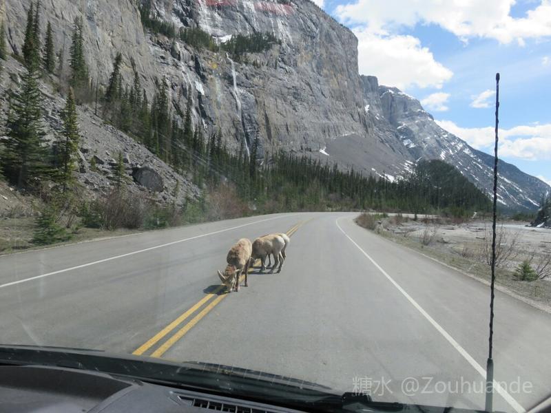 哥伦比亚冰原南北是截然不同的风景。北部是冰山,南部却是一片荒原。 路上经常有野生动物出没,很幸运,碰上三只大角羊,徘徊在大路中央。所有车都轻轻停下,所有人都静静停下,先是兴奋的拍照,然后都不约而同的静观大角羊悠闲自在的离去。