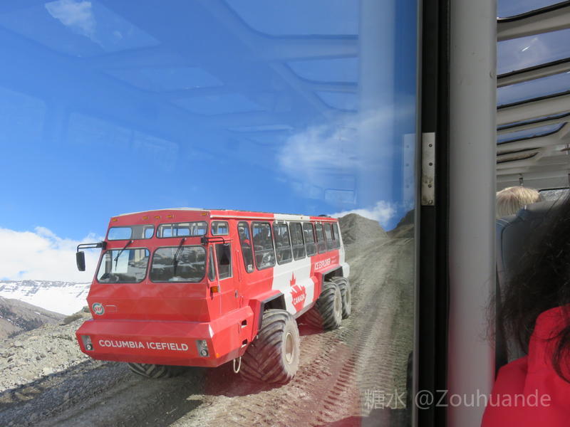 登上冰原,有两种方式。 一是徒步攀登。这需要经过专门训练,且装备齐全,不适合我们这些只为一睹冰原风光的旅游人。 二是乘大轮冰车。来加拿大时就听人说过,全世界一共有20辆大轮冰车,都在哥伦比亚冰原上。 大轮冰车独一无二,主要为防滑。原以为就是防冰滑,经历后才知也防路滑,尤其是陡峭的高坡,近乎于90度垂直高坡。