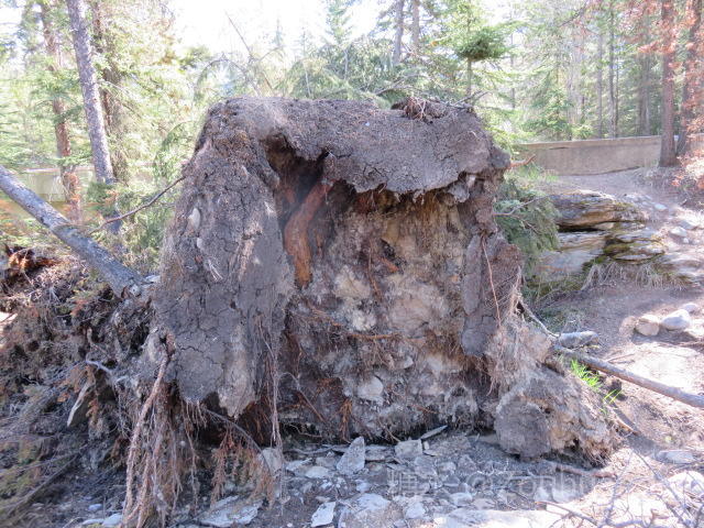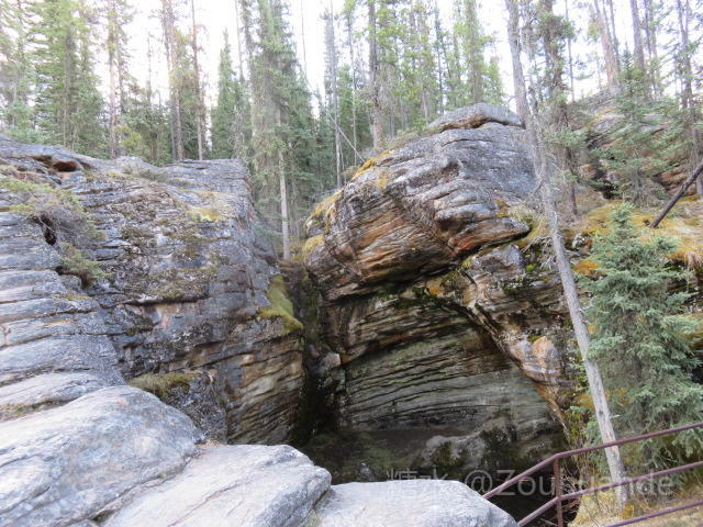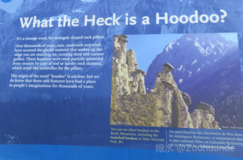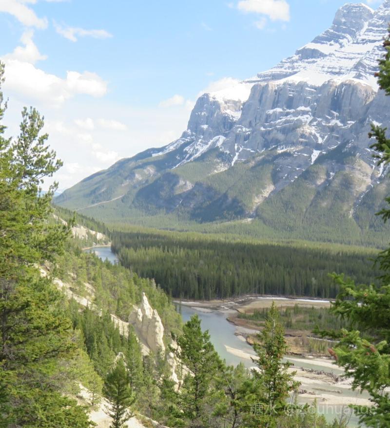 “胡徒”(Hoodoos)奇形石柱景点,亦称“魔鬼岩”,位于班夫小镇东北部弓河河谷惊叹角上。为什么叫弓河,因为最早生活在这里的印第安人,发现这里的树苗最适合做弓箭。 “胡徒”是石灰岩受千百年风化雨蚀而形成的石柱。一组约五、六根灰黄色的石柱矗立在弓河旁的半山坡上。 这是印第安人传说中鬼怪出没的地点。魔鬼岩经常发出异常的声音,印第安人就将魔鬼岩奉为神灵,顶礼膜拜。 细细看去,它就像哨兵俯视守卫着弓河。 我们只能在较高的观景台上往下看。这里的弓河有分支岔道,在“胡徒”前面的河道像个变形的太极图。再往前是一片平坦的针叶树林,远处巍然屹立着伦达尔山。伦达尔山据称是加拿大落基山脉中最有特色的山峰,它的岩石层次褶皱明显,岩层与地面大约成二十度夹角。