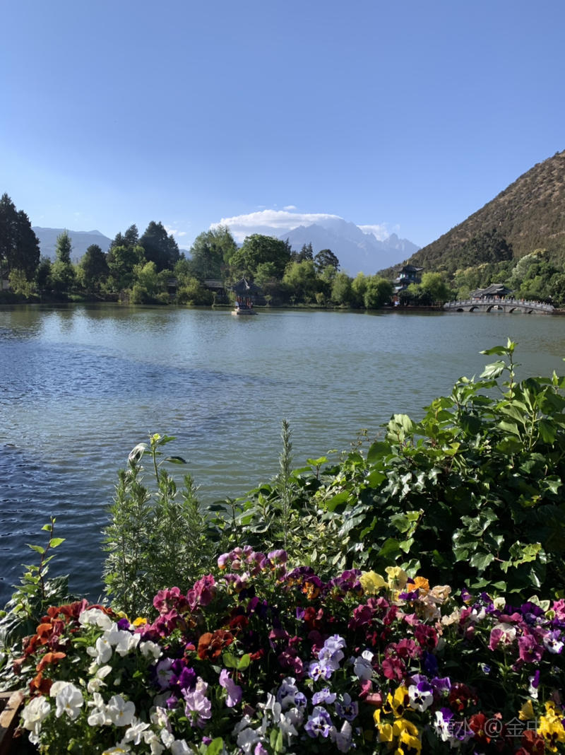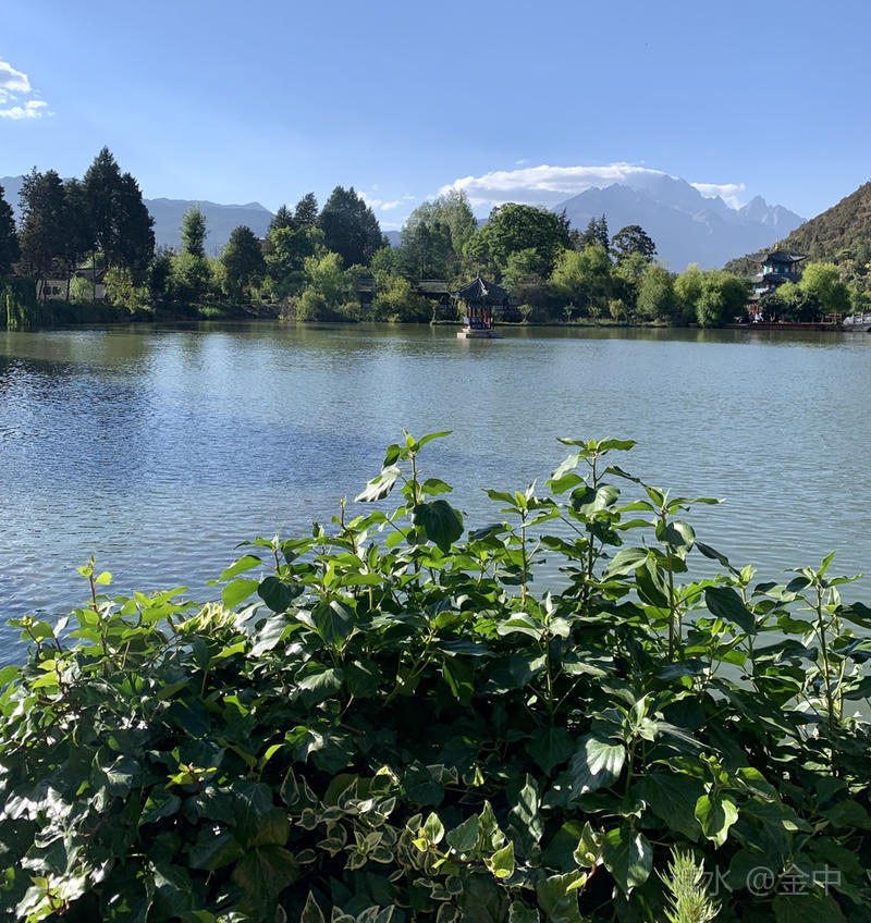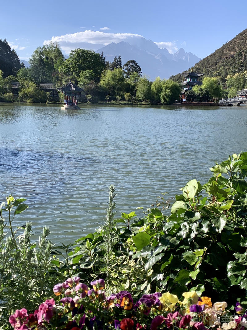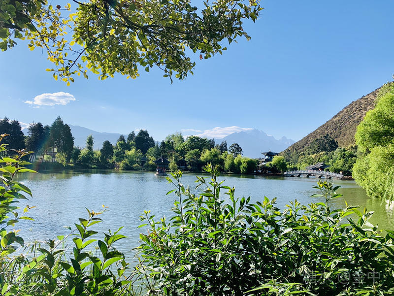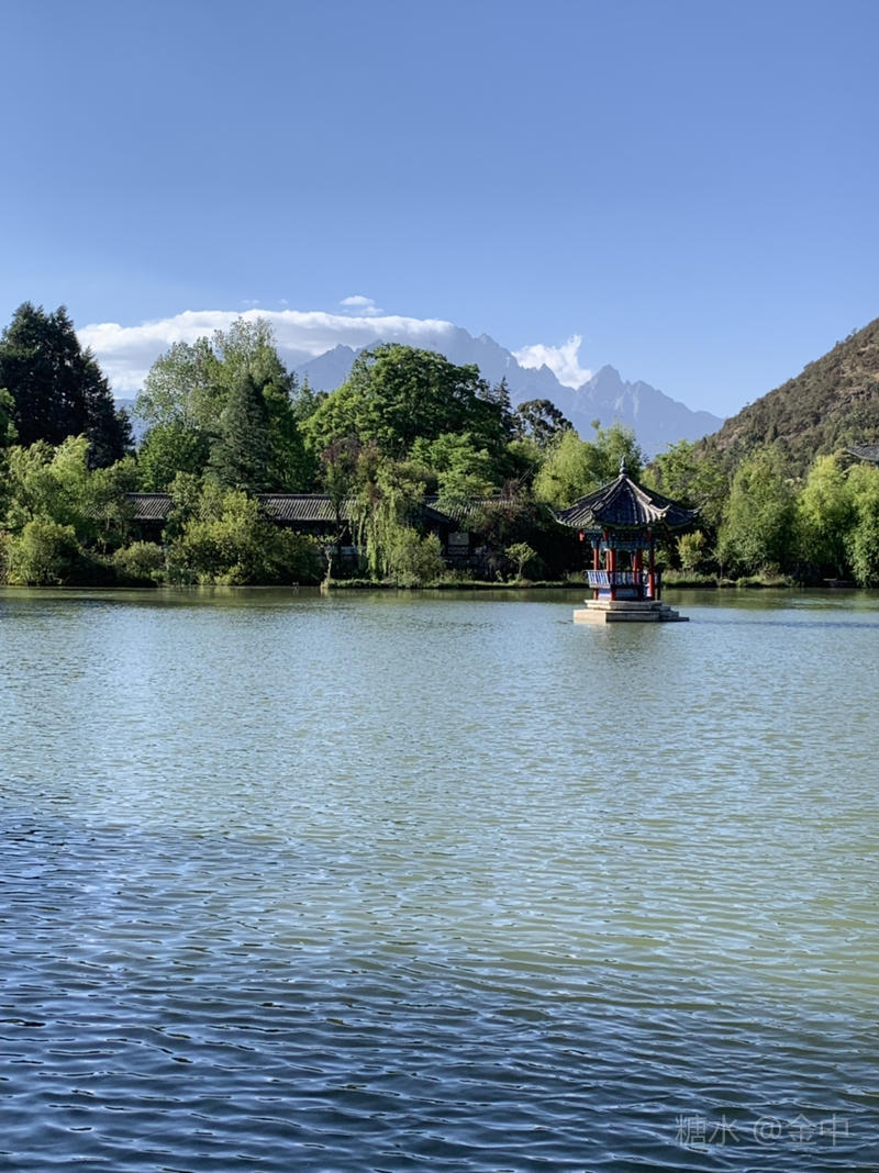 这里是黑龙潭公园最佳的观景和拍照点,远处玉龙雪山倒映在潭中,在这里可观雪山四万八千丈,银屏一角深插底的奇景。象山半壁也映入水中,黑龙潭山中有水,水中有山,山水相映,景色秀丽。