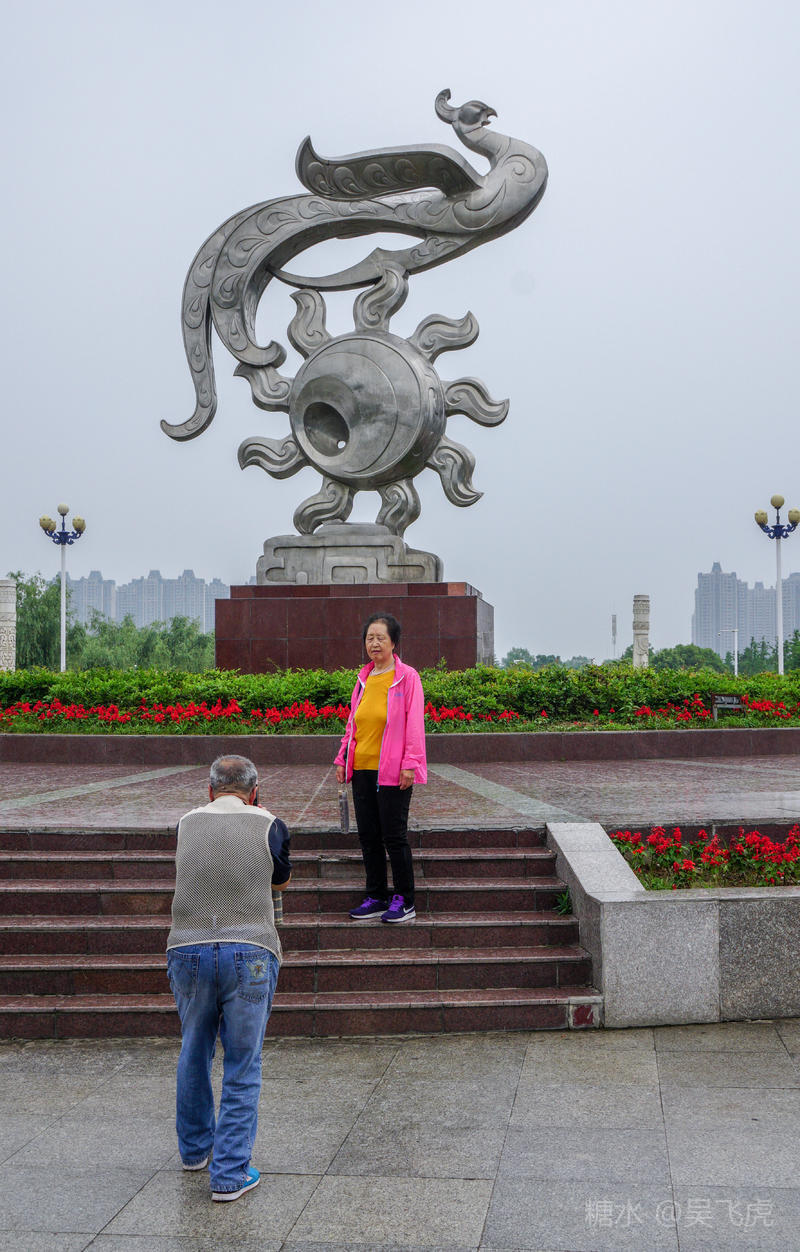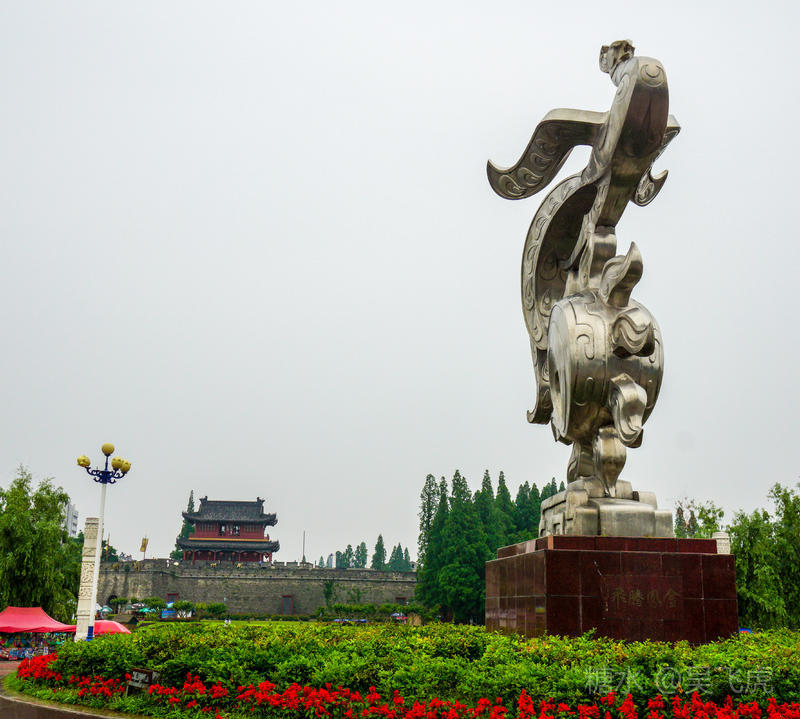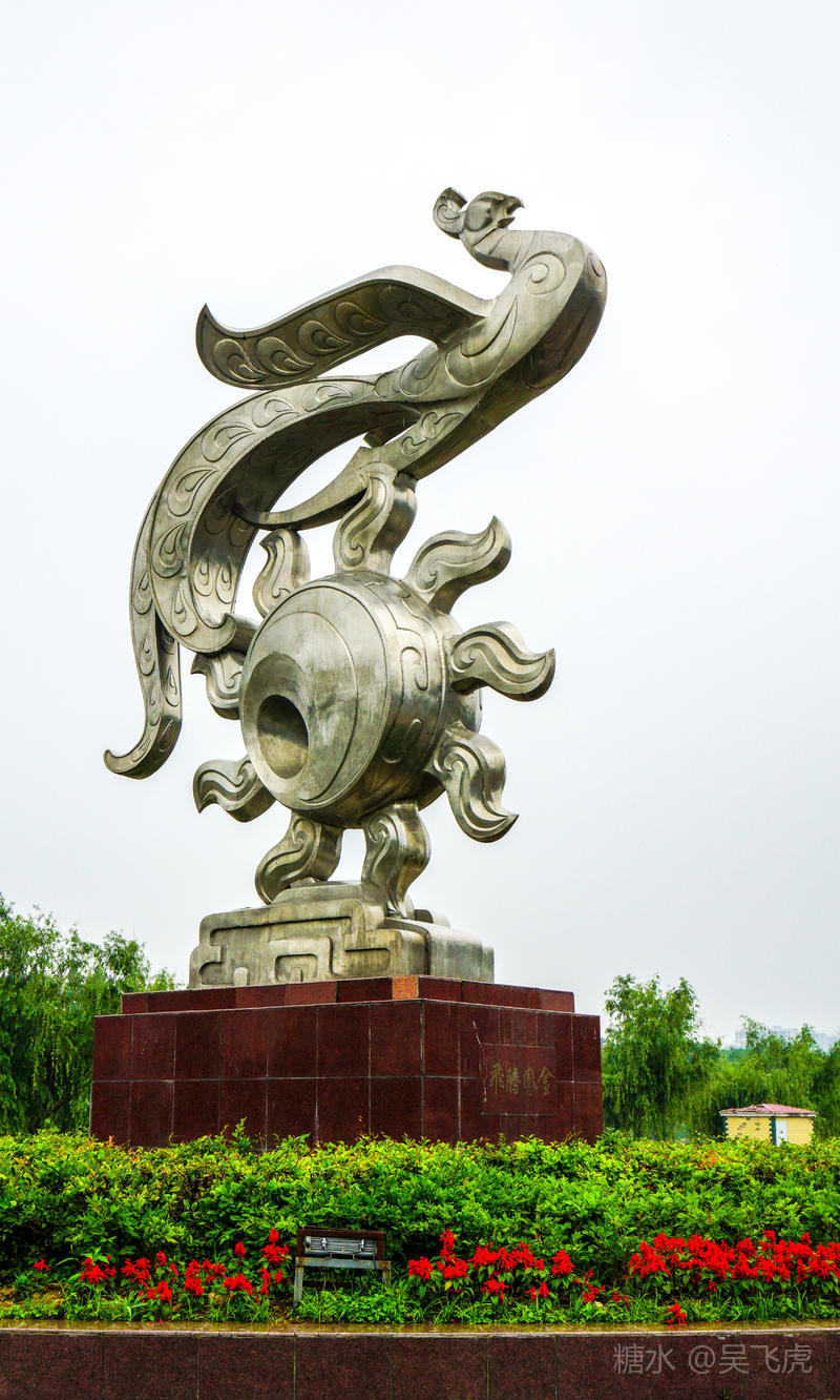 荆州护城河对面的公园中心处耸立一尊不锈钢的金风腾飞雕塑。