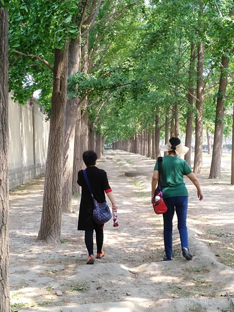 天晴气爽空气鲜,银杏大道绿荫伞, 两位美女步履健,老友聚会喜欢颜。